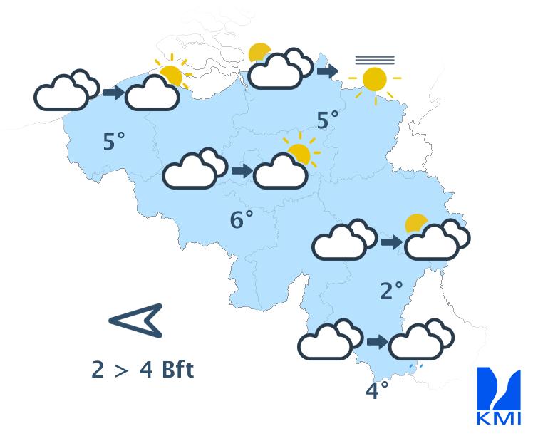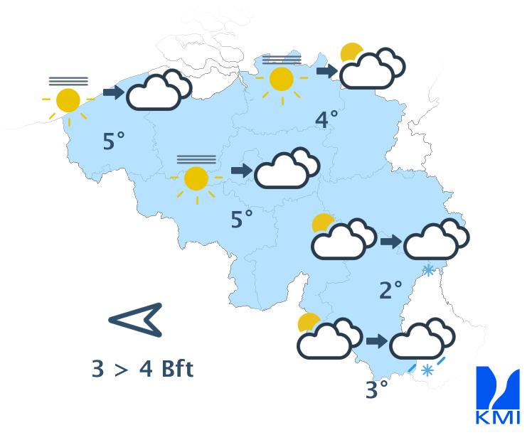 Deze namiddag krijgen we eerst nog opklaringen met wel vrij veel hoge sluierwolken. Geleidelijk neemt de bewolking toe vanaf de Franse grens en op het einde van de namiddag wordt het op vele plaatsen zwaarbewolkt. Over het uiterste zuiden kan er wat gedruppel of een beetje lichte (smeltende) sneeuw vallen. De maxima liggen tussen 0 graden in de Hoge Venen en 5 of 6 graden over het zuidwesten. Er waait een matige wind uit oost tot zuidoost met rukwinden tot 40 à 50 km/u. Zeer lokaal kunnen er op het Ardense reliëf pieken tot 60 of 70 km/u genoteerd worden.