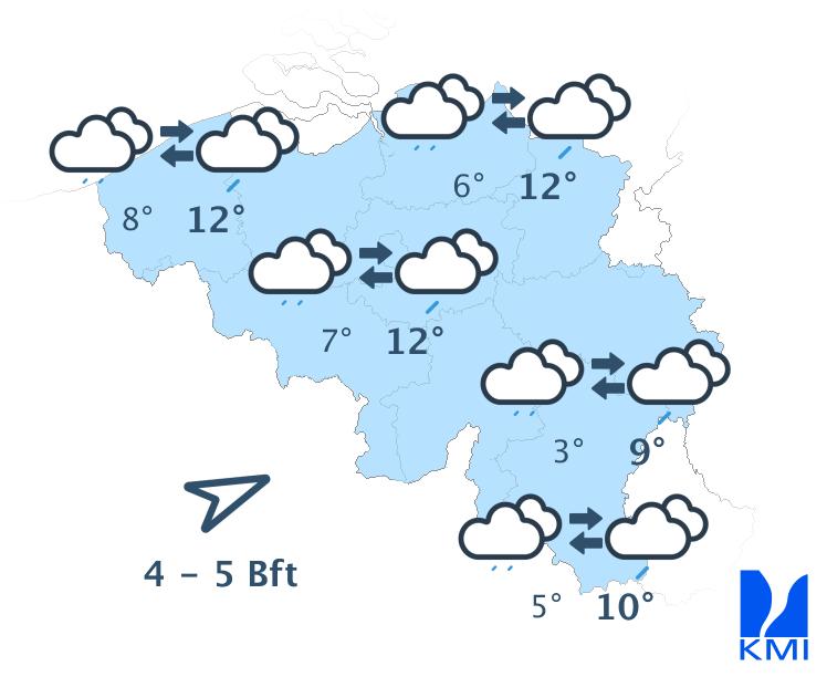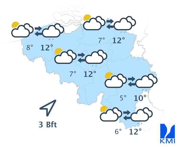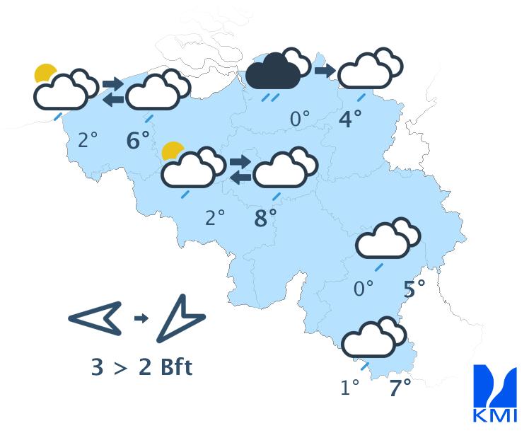 Donderdag blijft het meestal zwaarbewolkt met nog wat (lichte) regen, motregen of enkele buitjes. In de Hoge Venen valt er soms nog natte sneeuw. Hier en daar kunnen er enkele (korte) opklaringen voorkomen. We halen maxima van 1 of 2 graden op de Ardense hoogten tot 8 of 9 graden over het zuidwesten. Nabij de Nederlandse grens klimt het kwik niet hoger dan 4 of 5 graden. De matige oosten- tot zuidoostenwind draait naar het oosten tot het noordoosten en wordt op het einde van de dag zwak.