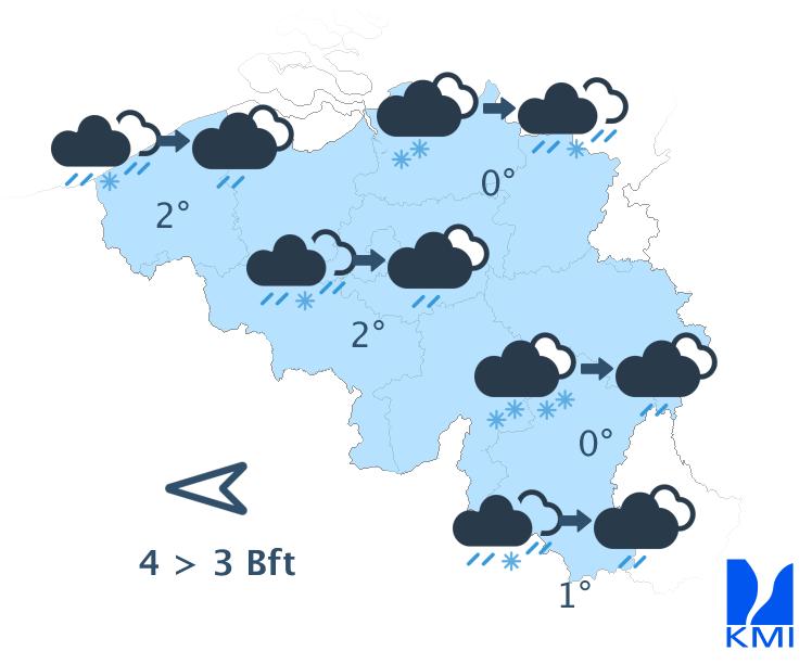 Vanavond en vannacht trekt een storing vanaf de Franse grens door ons land. Op de Ardense hoogten valt er daarbij meestal sneeuw (of later natte sneeuw) en elders eerst soms smeltende sneeuw en later regen. Over het noorden, en meer bepaald langs de Nederlandse grens, kan er tijdelijk een sneeuwlaag ontstaan. De minima schommelen van 0 of -1 graad in de Hoge Venen tot +3 of +4 graden over het zuidwesten. De wind waait matig tot soms vrij krachtig uit oost tot zuidoost met op de Ardense hoogten zeer lokaal windstoten tot 60 of 70 km/u (of eventueel wat meer). Elders verwachten we pieken tot 50 km/u.