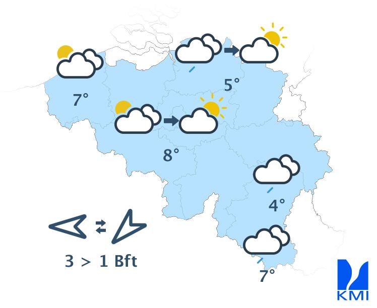 Vannacht trekt een neerslagzone vanaf de Franse grens noordwaarts over ons land. Op de Ardense hoogten valt er daarbij meestal sneeuw (en later natte sneeuw) en elders eerst soms smeltende sneeuw en later regen. Over het noorden, en meer bepaald langs de Nederlandse grens, kan er tijdelijk een sneeuwlaag ontstaan. Het blijft zwaarbewolkt tot betrokken. De minima schommelen van 0 of -1 graad in de Hoge Venen tot +3 of +4 graden over het zuidwesten. De wind waait matig tot soms vrij krachtig uit oost tot zuidoost met op de Ardense hoogten zeer lokaal windstoten tot 60 of 70 km/h (of eventueel wat meer). Elders verwachten we pieken tot 50 km/h.