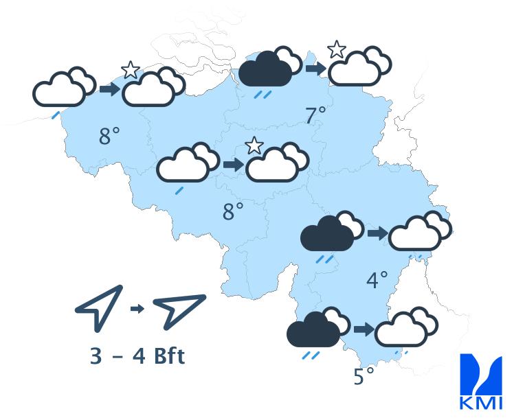 Vanavond trekt een regenzone over het land vanaf het westen. In de loop van de nacht wordt het stilaan droger maar motregen blijft mogelijk. De minima schommelen tussen 6 graden in de Hoge Venen en 11 graden in Vlaanderen. De wind draait eerder naar zuidwest en blijft matig in het binnenland maar wordt vrij krachtig tot krachtig aan zee.