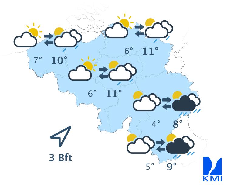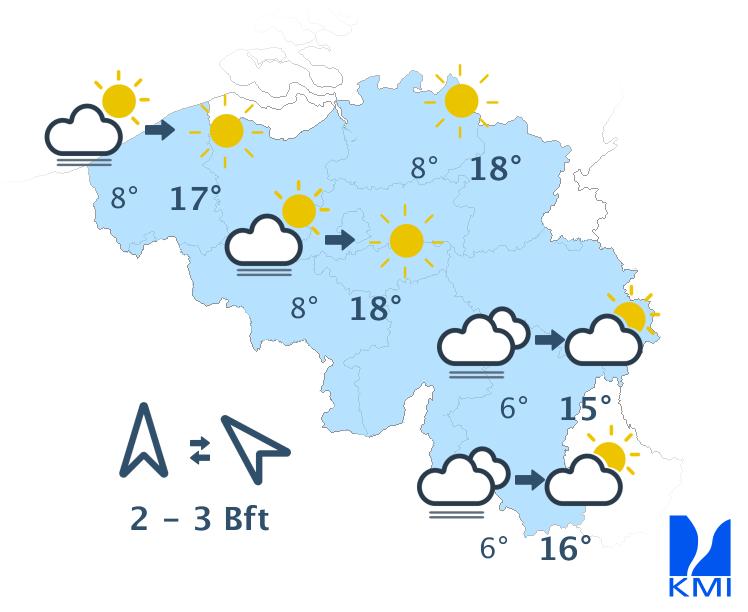 Dinsdag start met veel bewolking, in het oosten wellicht zelfs grijs met nog wat lichte neerslag. In de loop van de dag breekt de bewolking meer en meer open en krijgen we stilaan meer zon. Tegen de avond klaart het zo goed als uit. De wind is overwegend matig en draait van zuidwest naar zuid. De temperaturen klimmen tussen 10 à 11 graden in de Hoge Ardennen en 15 graden op de meeste plaatsen in Vlaanderen.