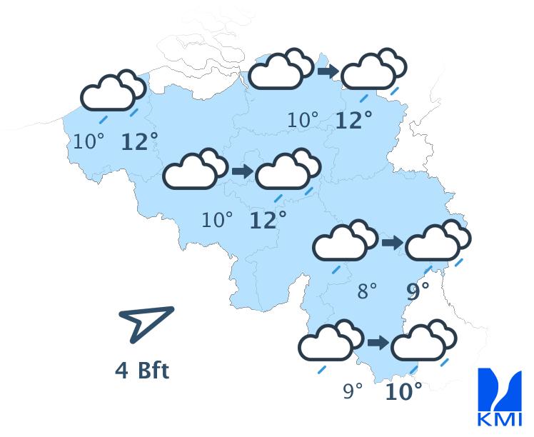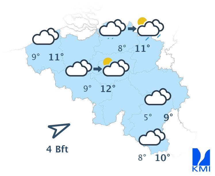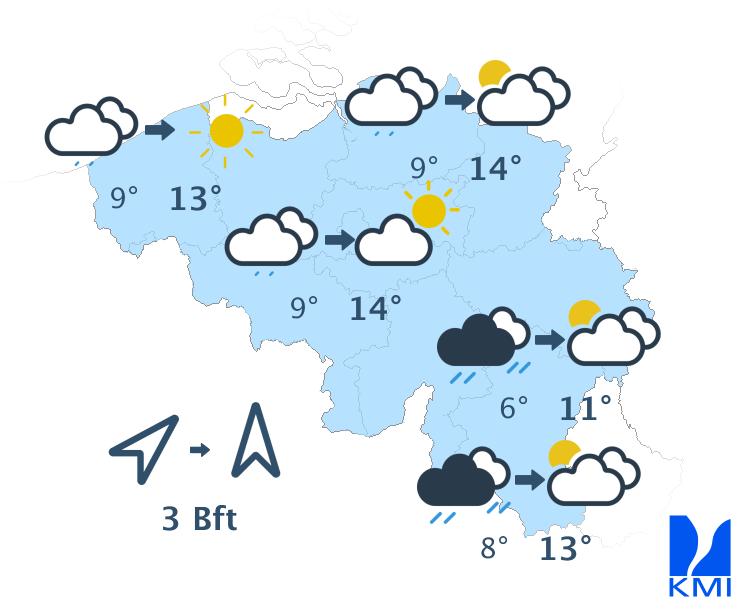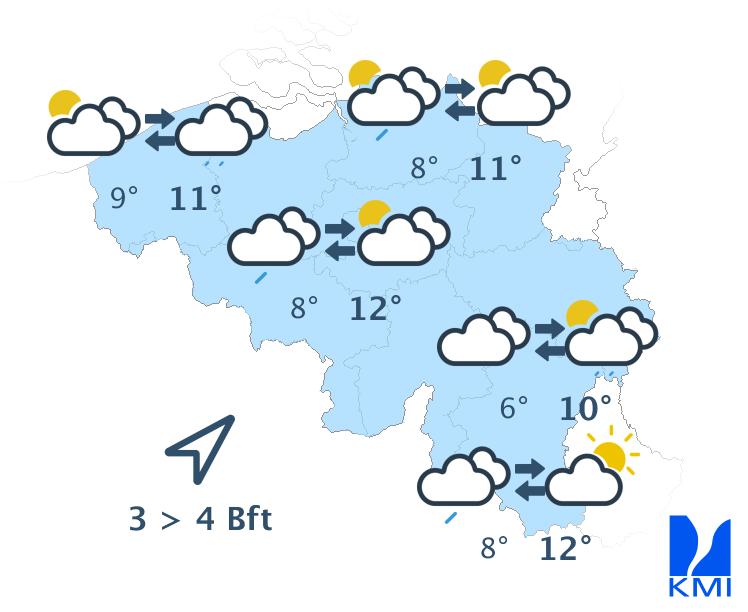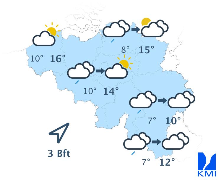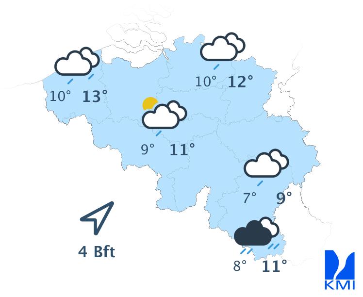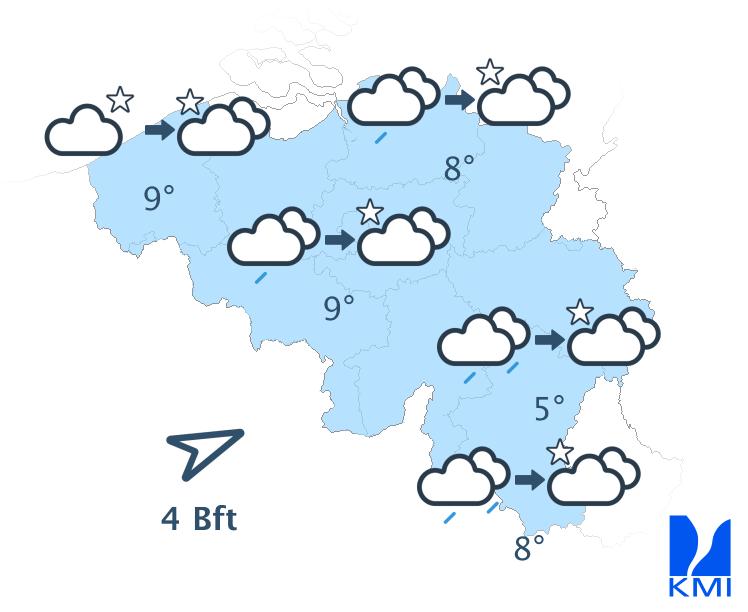 Morgenochtend is het grijs met wat lichte regen of motregen. Vervolgens krijgen we tijdelijk opklaringen. In de namiddag komen er in de oostelijke helft van het land buien tot ontwikkeling, terwijl het vaak droog wordt in het westen en het centrum. Vanaf de Franse grens neemt de bewolking echter opnieuw toe en 's avonds bereikt een nieuwe regenzone onze streken. De maxima liggen tussen 7 graden in de Oostkantons en 11 of 12 graden in Laag-België. De westzuidwestenwind waait matig tot vrij krachtig, met rukwinden tussen 50 en 60 km/h in het binnenland en tot 70 km/h aan de kust.