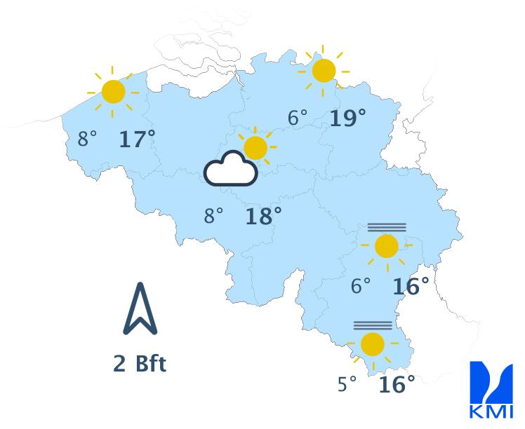 Woensdag wordt het zonnig met eventueel wat hoge wolkenvelden. In het uiterste oosten is er 's ochtends wat lage bewolking mogelijk. De maxima liggen tussen 14 graden in de Hoge Venen en 18 graden in de Kempen. De wind waait zwak tot meestal matig uit zuidelijke richtingen.