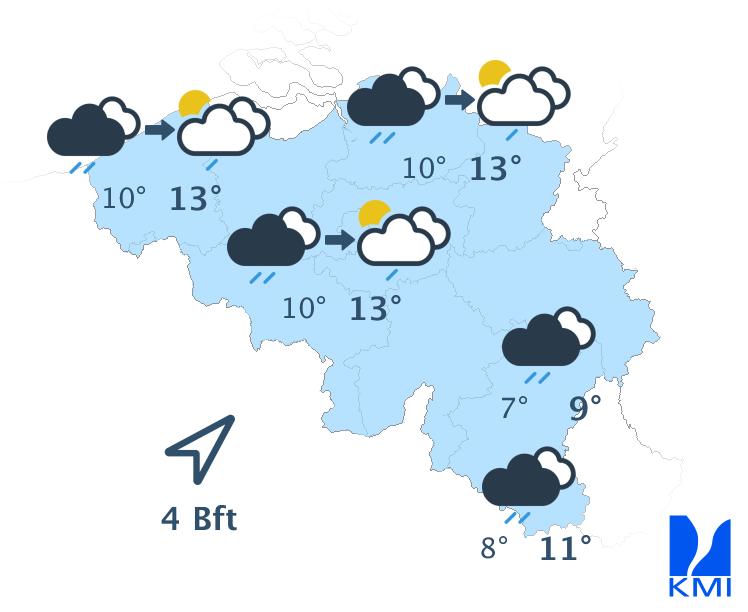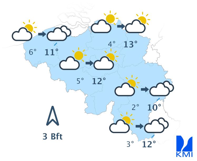 Morgen is het in de voormiddag grijs met veel lage wolkenvelden die in de Ardennen lokaal voor slecht zicht zorgen. Vooral in de oostelijke landshelft kan er soms lichte regen of motregen vallen. In het westen is het overwegend droog maar eveneens zwaarbewolkt. In de late namiddag verschijnen er vanaf het westen en zuiden opklaringen. In het noordoosten blijft het waarschijnlijk de ganse dag bewolkt. Het wordt nog wat zachter. We halen maxima van 10 graden in de Ardennen tot 14 of lokaal 15 graden in Laag-België nabij de grens met Frankrijk. De wind waait eerst zwak tot matig en nadien meestal zwak en krimpt van het zuidwesten naar het zuiden.