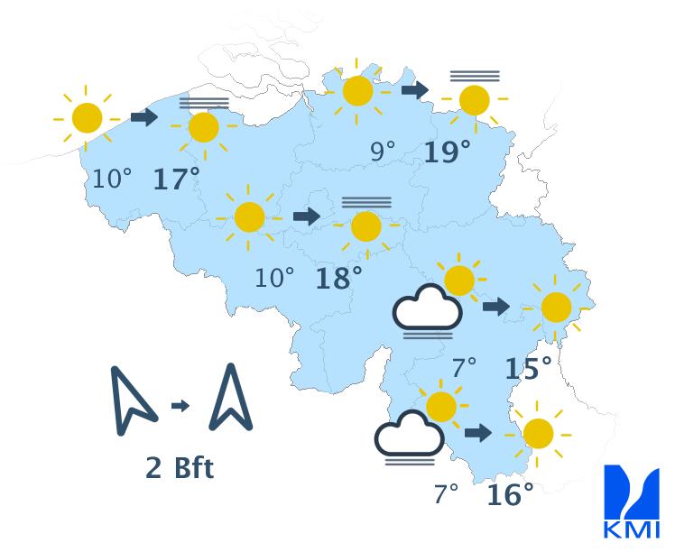 Vanavond klaart het uit en vannacht wordt het in de meeste streken helder. In het zuidoosten vormt er zich lage bewolking en/of mist. Elders kan het lokaal mistig worden. De minima schommelen tussen 4 graden in de Ardense valleien en 8 graden in het westen. De wind is overwegend zwak uit zuid tot zuidoost, aan zee en op de Ardense Hoogten eerder matig.