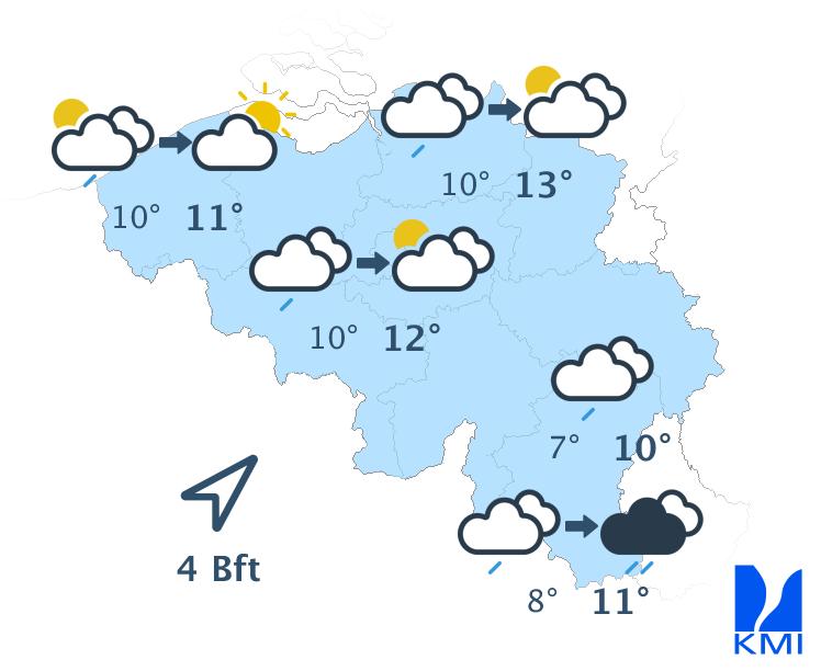 Deze ochtend en deze voormiddag is het grijs en nevelig met lage bewolking die in de Ardennen lokaal voor slecht zicht zorgt. Soms kan er nog lichte regen of motregen vallen. In de loop van de dag wordt het droog met aanvankelijk nog veel bewolking. In de latere namiddag verschijnen er opklaringen vanaf het westen en het zuiden. In het noordoosten blijft het wellicht zwaarbewolkt tot vanavond. Het wordt zachter dan de voorbije dagen met maxima van 10 graden in de Ardennen tot 15 graden in het westen. De zwakke tot matige wind uit westzuidwest wordt geleidelijk zwak uit zuidelijke richtingen.