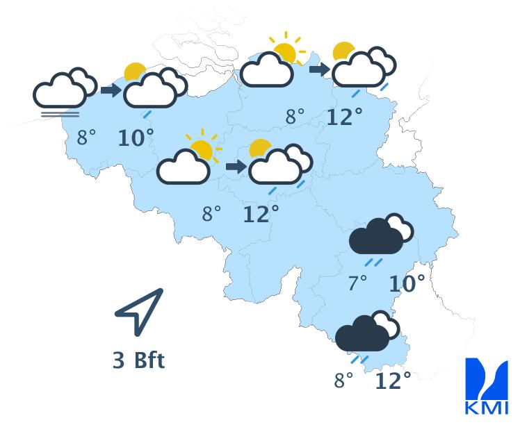Vrijdagochtend start met vaak brede opklaringen, behalve over het westen en het noordwesten waar het al bewolkt is. Rond de middag bereikt een eerder zwakke regenzone de kust en zij trekt vervolgens geleidelijk over de rest van het land. Het wordt in de namiddag dus vrijwel overal zwaarbewolkt met soms regen. Over het uiterste oosten en zuidoosten blijft het mogelijk droog tot de avond met daar nog lange tijd opklaringen. Aan de achterzijde van de storing wordt het in de late namiddag in het westen opnieuw droog met enkele opklaringen. Het blijft zacht met maxima rond 15 graden in het centrum. In de Kempen en in Belgisch Lotharingen kan het kwik klimmen tot 16 graden. Aan zee is het koeler met maxima rond 12 graden. De zuidwestenwind waait matig en aan zee soms vrij krachtig.