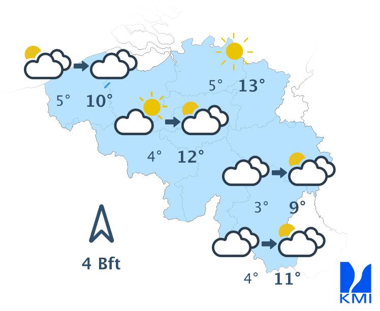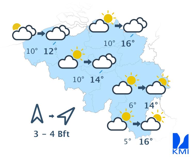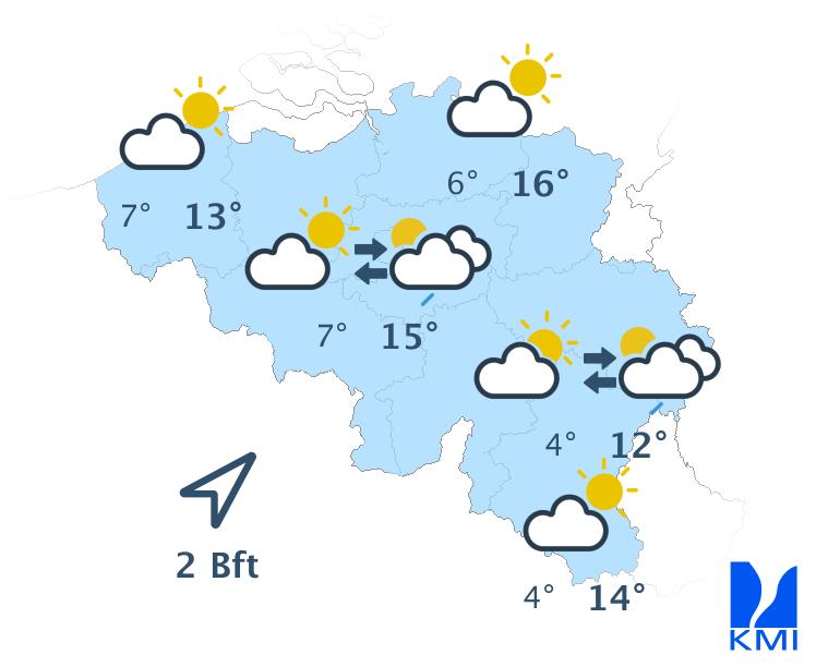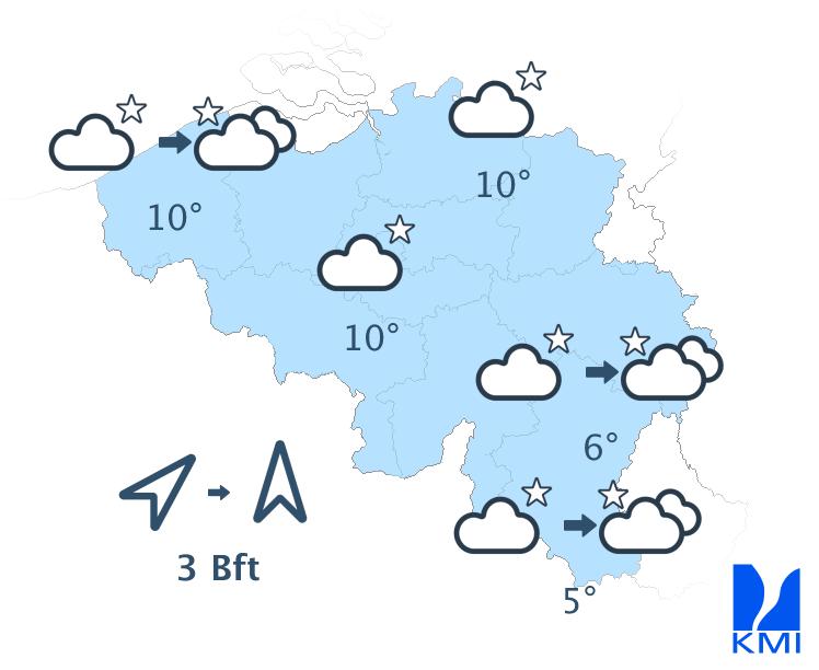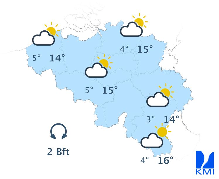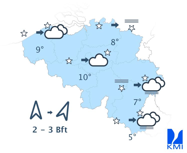 Vannacht is het in vele streken helder tot lichtbewolkt met geleidelijk wel meer wolkenvelden over de noordwestelijke helft van het land. Langs de zuidelijke flanken van de Ardennen en in Belgisch Lotharingen ontstaan er stilaan lage wolken en/of mistbanken. De minima liggen tussen 4 en 7 graden ten zuiden van Samber en Maas en tussen 7 en 10 graden elders. De wind waait zwak tot matig, eerst uit zuid tot zuidoost, later draaiend naar zuid tot zuidwest.