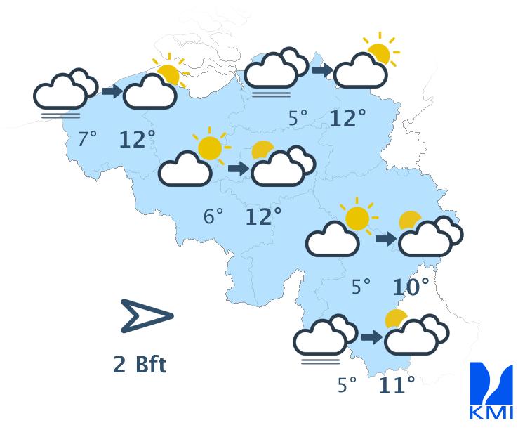 Woensdagochtend is er kans op lokale lage bewolking die in de namiddag verdwijnt zodat het overal vrij zonnig wordt. Het is wat minder zacht met maxima in het centrum rond 13 graden.
