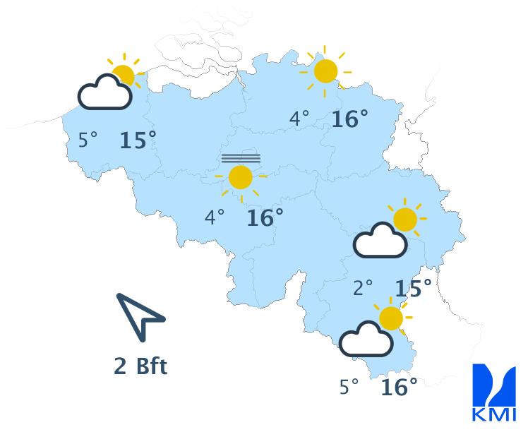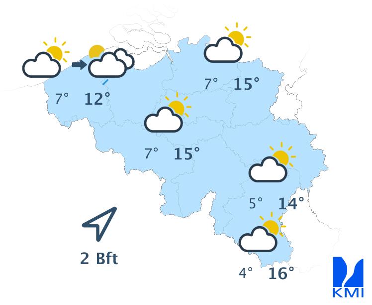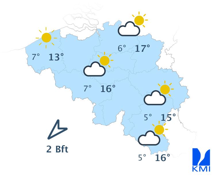 Deze ochtend is het eerst zonnig. Later in de ochtend drijven wolkenvelden van het noordwesten richting centrum, terwijl een regenzone vanaf de kust het land binnenkomt en in de namiddag het centrum bereikt. Ten zuiden van Samber en Maas blijft het waarschijnlijk droog met brede opklaringen. De maxima liggen rond 11 à 12 graden aan zee, 13 à 14 graden in de Ardennen en tot 18 graden in de Kempen. De matige zuidenwind draait naar zuidzuidwest en is aan zee af en toe vrij krachtig.