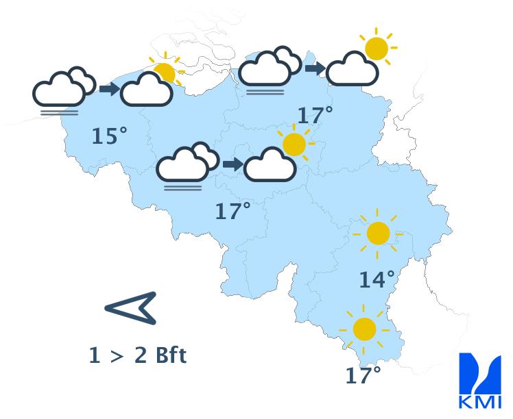 Zondag is het opnieuw zonnig en droog. De maxima schommelen van 15 graden in de Hoge Venen en 17 graden op de meeste andere plaatsen. De wind is overwegend zwak uit zuidoostelijke richtingen.