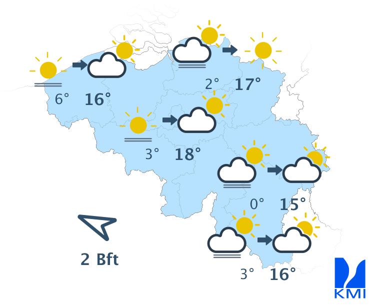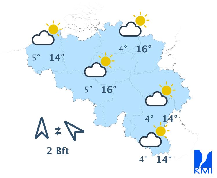 Morgen krijgen we volop zon. Met een zwakke tot matige zuidoostelijke wind stijgen de temperaturen tussen zo'n 14 of 15 graden in de Hoge Ardennen en 18 à 19 graden in Laag- en Midden-België en lokaal mogelijk 20 graden.