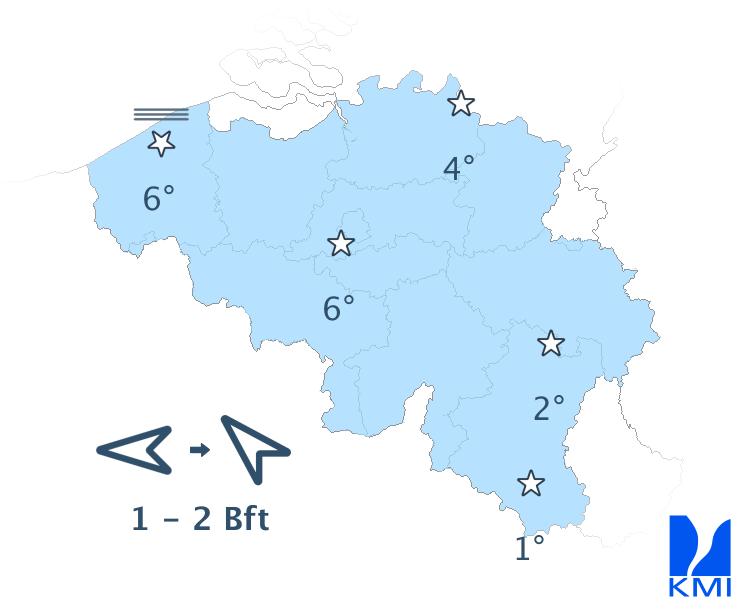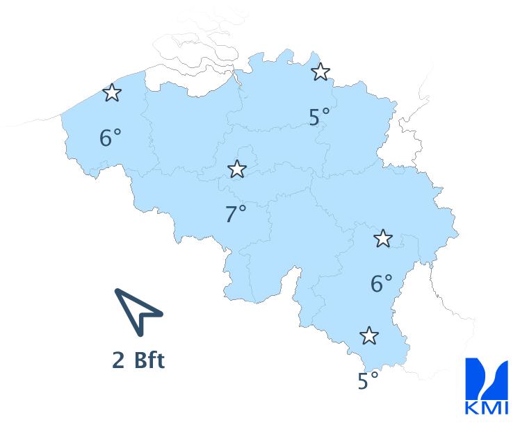 Vannacht blijft het droog en wordt het vrijwel helder. De minima liggen op de meeste plaatsen tussen 0 en 7 graden, in sommige Ardense valleien koelt het echter af tussen 0 en -5 graden. De wind waait meestal zwak uit oost tot zuidoost.