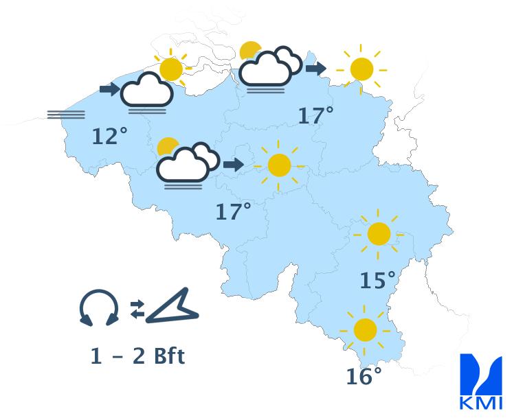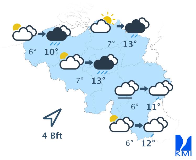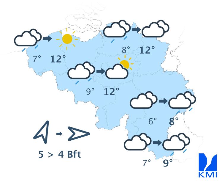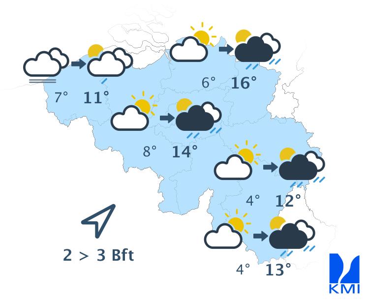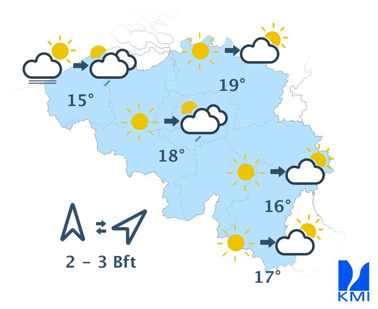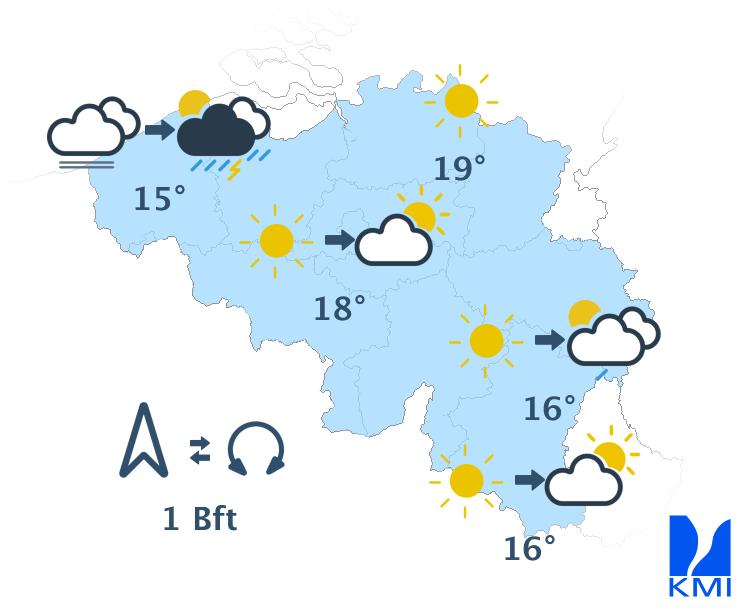 Morgen begint het mistig in het uiterste noordwesten. Elders is het bewolkt met enkele buien. In de namiddag wordt het wisselend bewolkt en kunnen de buien intenser worden. In het centrum tot oosten kunnen de buien uitgroeien tot een onweer. De maxima liggen tussen 10 graden in de Hoge Venen en 15 graden in de Kempen. De wind waait zwak of matig uit het zuidwesten.