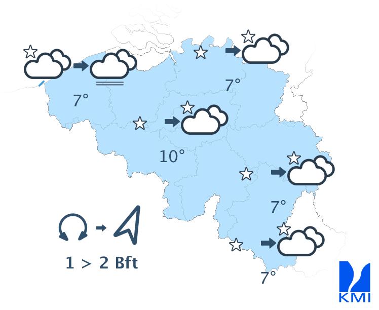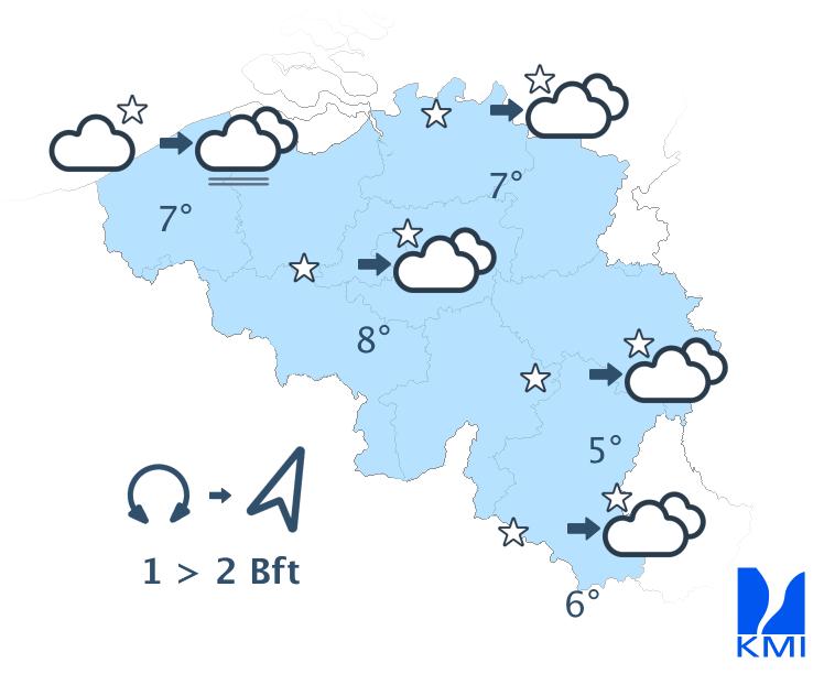 In het eerste deel van de nacht is er vooral in de Ardennen nog kans op een enkele bui (eventueel met een donderslag). In de meeste streken wordt het lichtbewolkt of helder. Later in de nacht kan er mist gevormd worden in het noordwesten. Op het eind van de nacht neemt de bewolking en de kans op buien toe vanaf het zuidwesten. De minima liggen tussen 2 en 7 graden in de Ardennen en tussen 6 en 8 graden elders. De wind waait zwak uit veranderlijke richtingen of uit het zuiden tot zuidwesten.