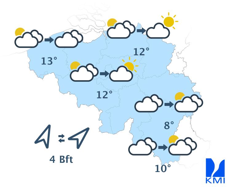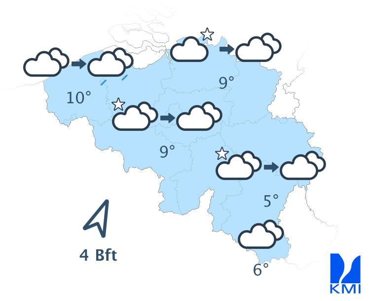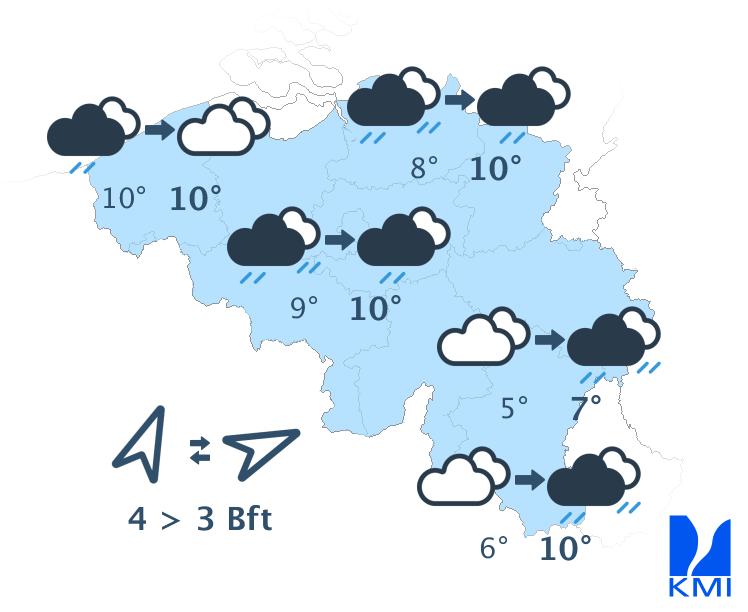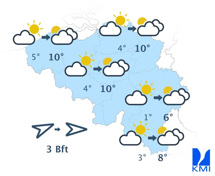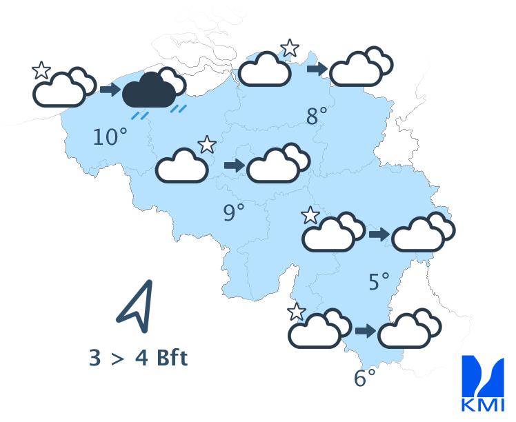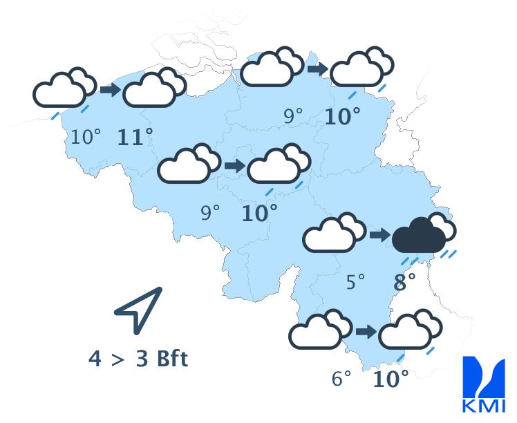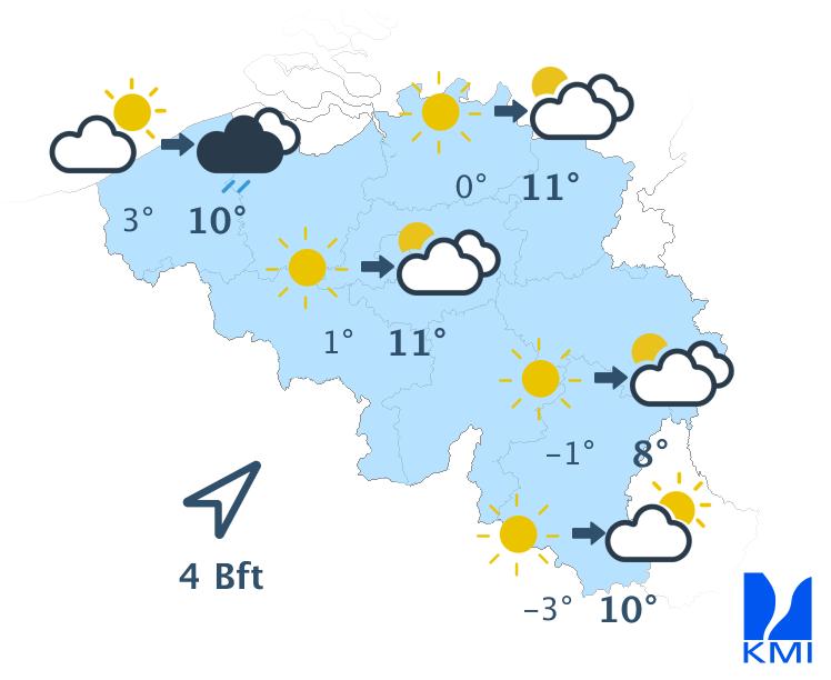 Vanavond trekken de laatste buien oostwaarts en ontwikkelen er zich brede opklaringen vanaf het westen. Vannacht klaart het overal uit, maar aan het einde van de nacht vormt er zich lage bewolking en mist in de zuidelijke Ardennen en Belgisch Lotharingen. De minima liggen ruwweg tussen 0 graden in de Hoge Ardennen, 4 graden in het centrum en 5 of 6 graden aan zee. De zwakke tot matige westenwind krimpt naar het zuidwesten.