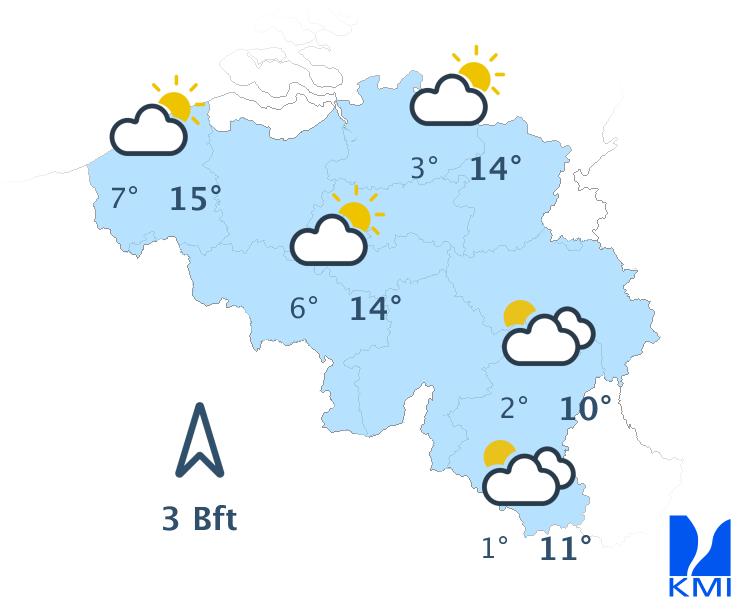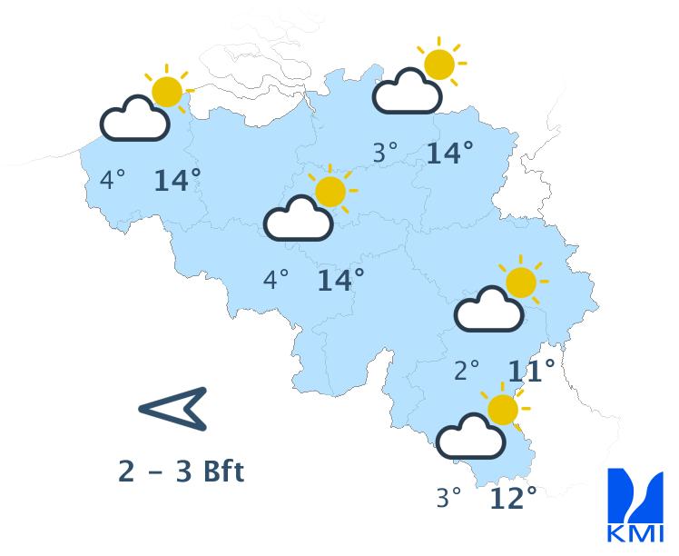 Woensdag lijkt een mooie zonnige dag te worden met maxima rond 12 graden in de Ardennen en 15 graden in het centrum.