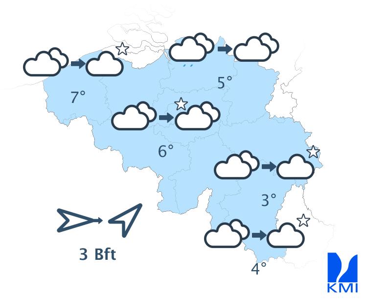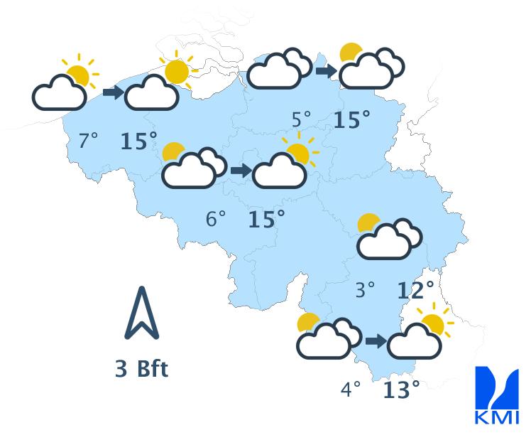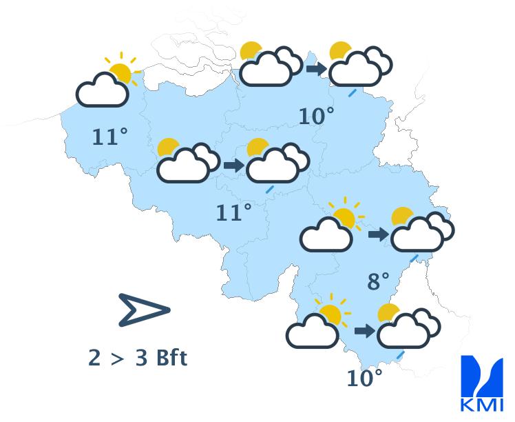 Morgenochtend is het op vele plaatsen zwaarbewolkt, maar vanaf het zuidwesten komen er snel opklaringen, die alsmaar breder worden. In het oosten blijft de bewolking hardnekkiger aanwezig. De maxima liggen tussen 10 graden in de Hoge Venen en 15 graden in Laag-België. De wind waait matig uit het zuiden.