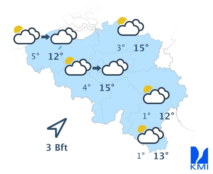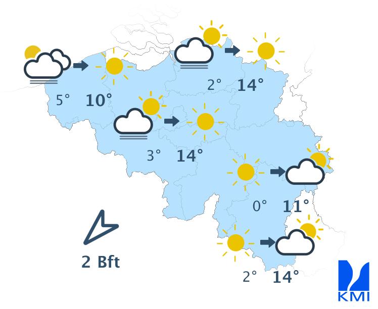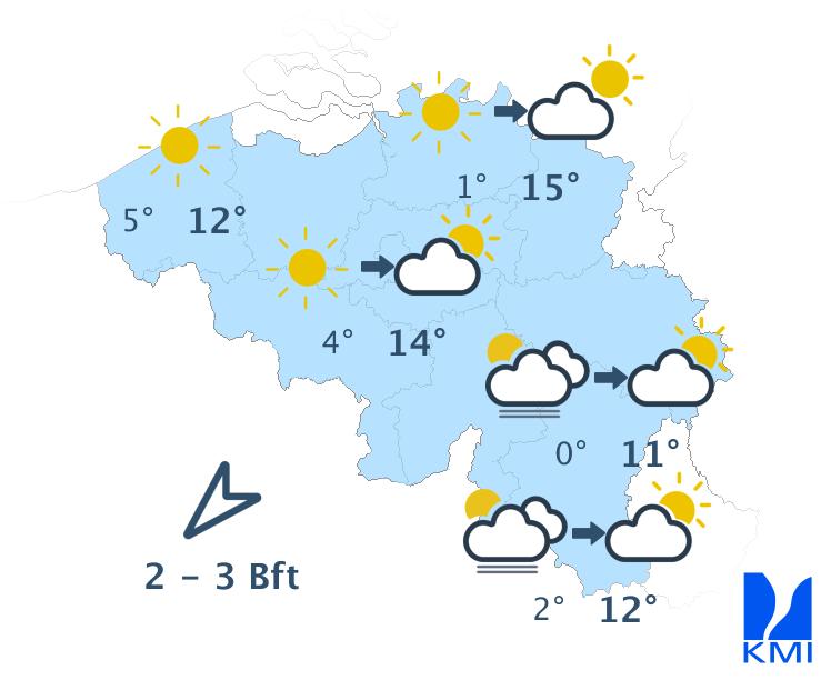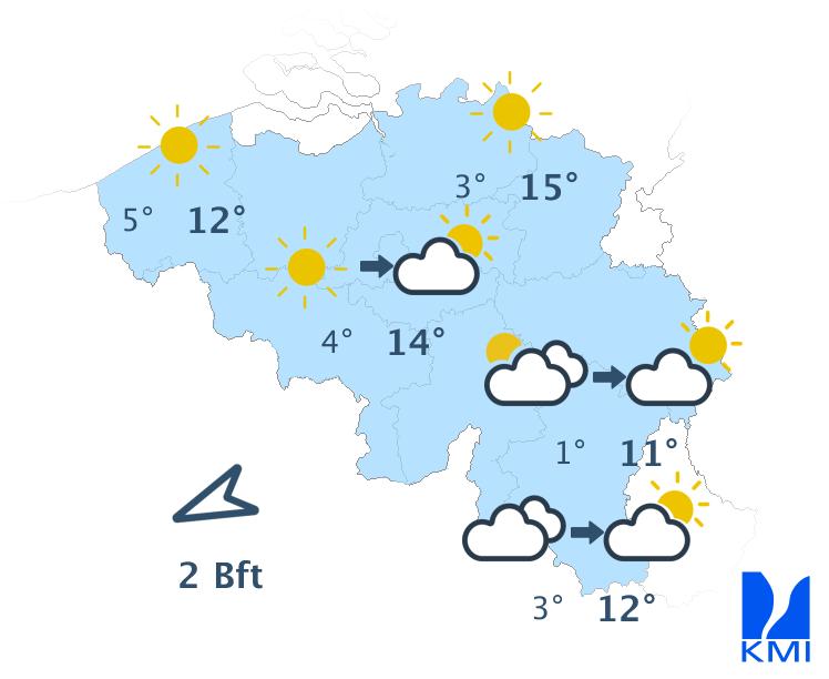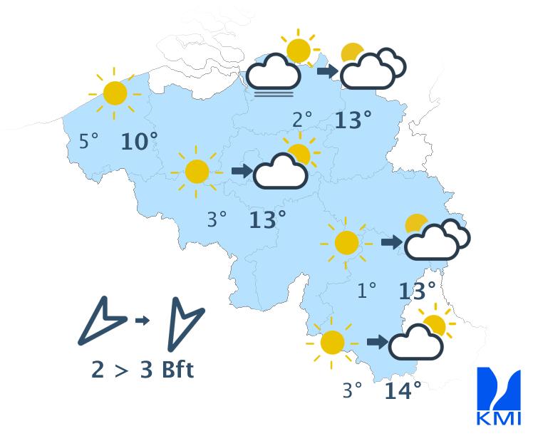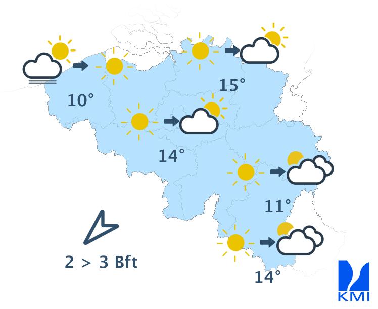 Zondag is het overwegend zonnig met later soms enkele wolkenvelden. De maxima liggen tussen 10 en 15 graden. De wind waait zwak tot matig uit oost tot noordoost. Aan zee steekt er na de middag een matige zeebries op uit noordnoordoost.