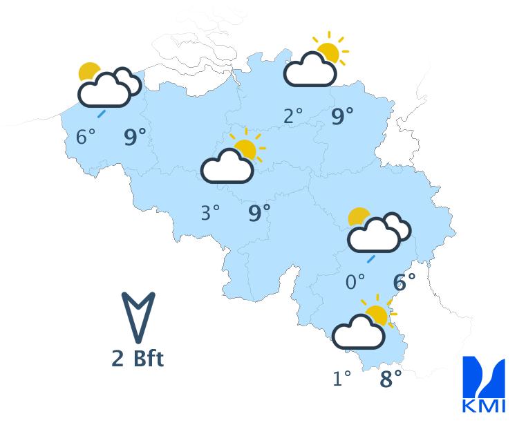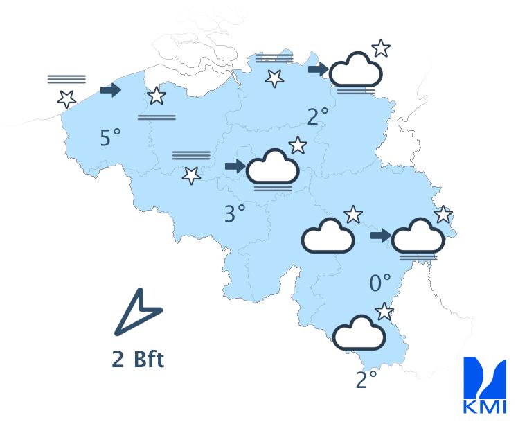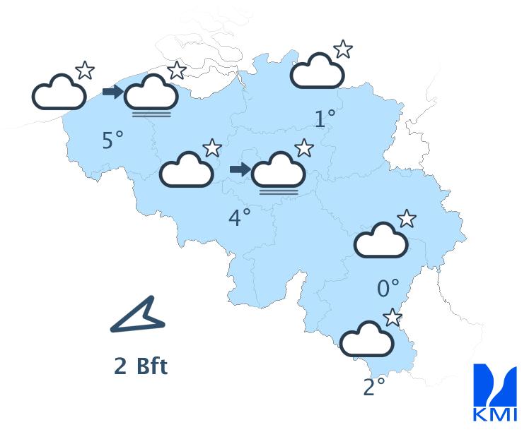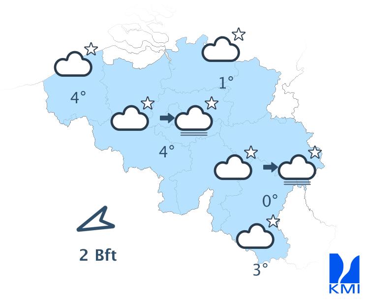 Vanavond is het overwegend licht bewolkt met vooral hoge sluierwolken en in het zuiden nog enkele stapelwolken. In de loop van de nacht vormen zich plaatselijke mistbanken in sommige Ardense valleien. Tegen het einde van de nacht breiden lage wolkenvelden zich uit over Laag- en Midden-België vanuit Nederland. De minima liggen tussen -2 en 3 graden in de Ardennen (lokaal tot -5 graden in sommige valleien), tussen 0 en 3 graden in de laagvlakten en rond 5 graden aan zee. De wind wordt zwak uit noordoost of veranderlijk.