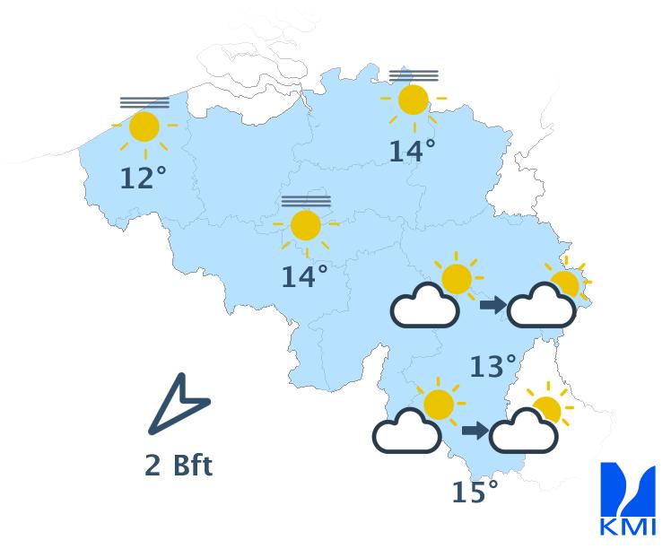 Zaterdagochtend komen er plaatselijk mistbanken in Laag- en Midden-België, terwijl ze ten zuiden van Samber en Maas meer lokaal blijven. Ze lossen echter snel op en maken plaats voor mooie zonnige perioden en enkele stapelwolken. Deze wolken zijn talrijker boven het Ardens massief, waar langs de Duitse en Luxemburgse grens een zwakke, lokale bui niet uitgesloten is. De maxima liggen rond 9 graden in de Hoge Venen, 10 graden aan zee en 13 à 14 graden in het centrum. De wind waait matig uit noordoost tot noordnoordoost.