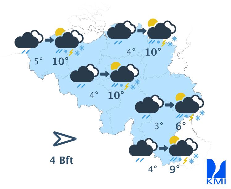 Woensdag trekt een regenzone van west naar oost door het land, snel gevolgd door voorsjaarsbuien. Tussen de buien door is er ook wat ruimte voor wat zon. Er is kans op onweer. Het is gevoelig frisser met maxima rond 10 graden in het centrum. Er zijn rukwinden mogelijk rond 55 à 60 km/h.