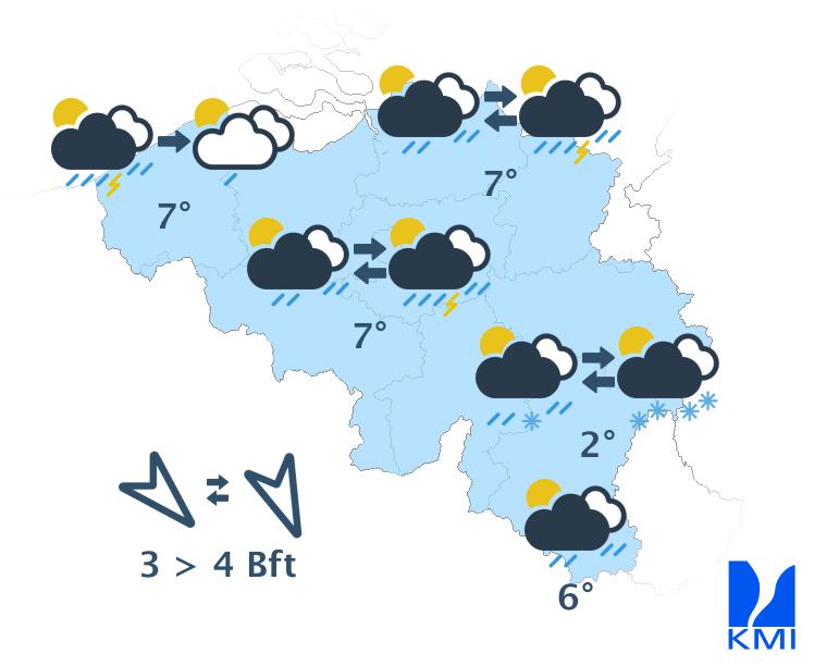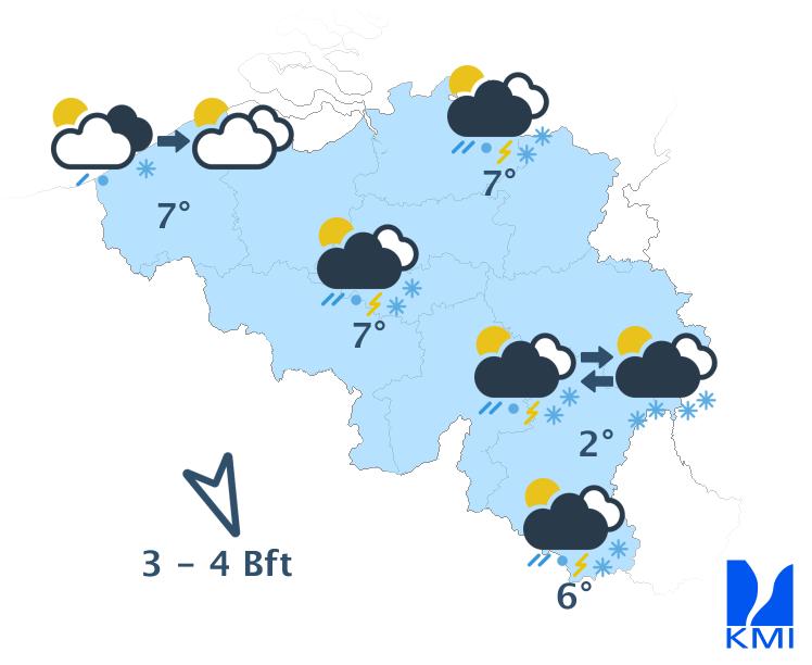 Deze namiddag blijft het wisselvallig met maartse buien. In de Ardennen vallen de buien voornamelijk als (smeltende) sneeuw. Ook een donderslag is nog altijd mogelijk. Tegen de avond wordt het in het westen al droger. De maxima liggen tussen 1 graad in de Hoge Venen en 7 à 8 graden in Vlaanderen. Er waait een matige en aan zee vrij krachtig wind uit noordnoordwest. De rukwinden kunnen oplopen tussen 50 en 65 km/h.