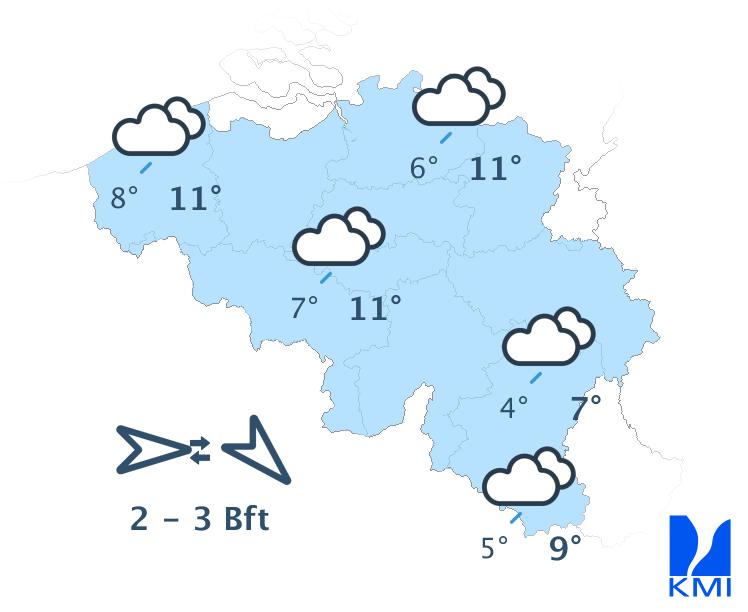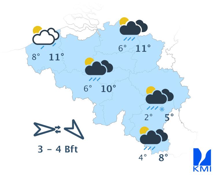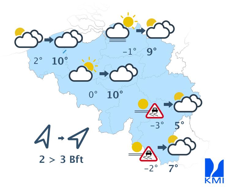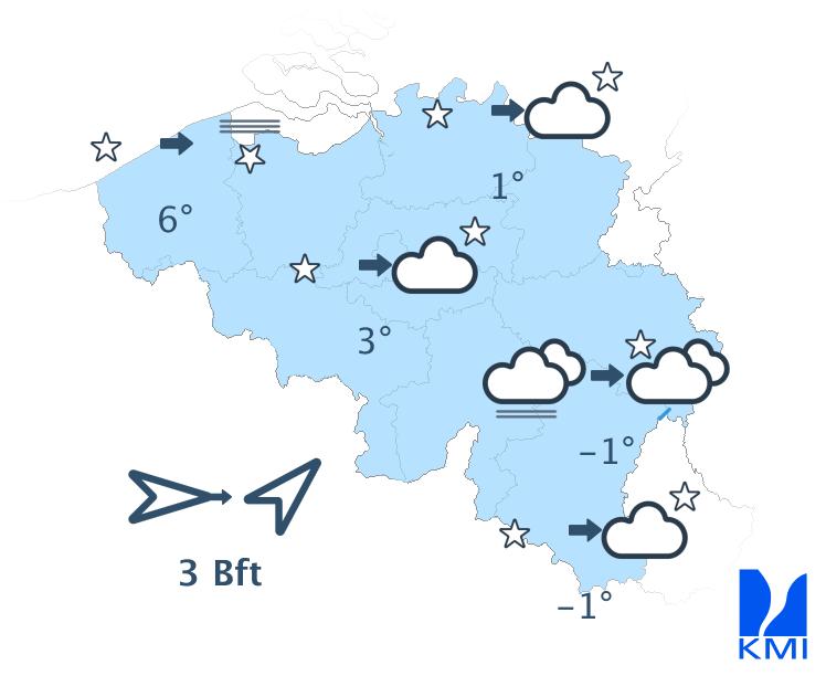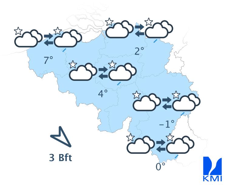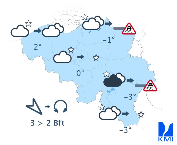 Vanavond en vannacht is het nog wisselend bewolkt met in het centrum en oosten van het land nog winterse buien. Ten zuiden van Samber en Maas vallen die onder vorm van sneeuw die blijft liggen en ook in Laag- en Midden-België kan de (natte) sneeuw, afhankelijk van de intensiteit van de bui, blijven liggen. Later in de nacht wordt het dan droog met bredere opklaringen. Er kan zich dan ook mist vormen die kan aanvriezen. In het westen blijft het droog met vanavond brede opklaringen, later vannacht hoge bewolking vanaf het westen. De wind neemt af en wordt in het binnenland zwak uit veranderlijke of zuidwestelijke richtingen. Aan zee blijft de wind matig en draait hij naar zuidzuidwest. Het koelt af tussen -4 graden in de Hoge Ardennen, 0 of -1 graden in het centrum en 2 graden aan zee. In sommige Ardense valleien kunnen de temperaturen in geval van brede opklaringen wegzakken tussen -5 en -10 graden. Vooral in het centrum en het oosten van het land kan het ook glad worden door ijs- en rijmplekken.