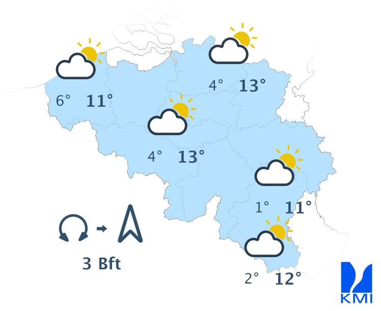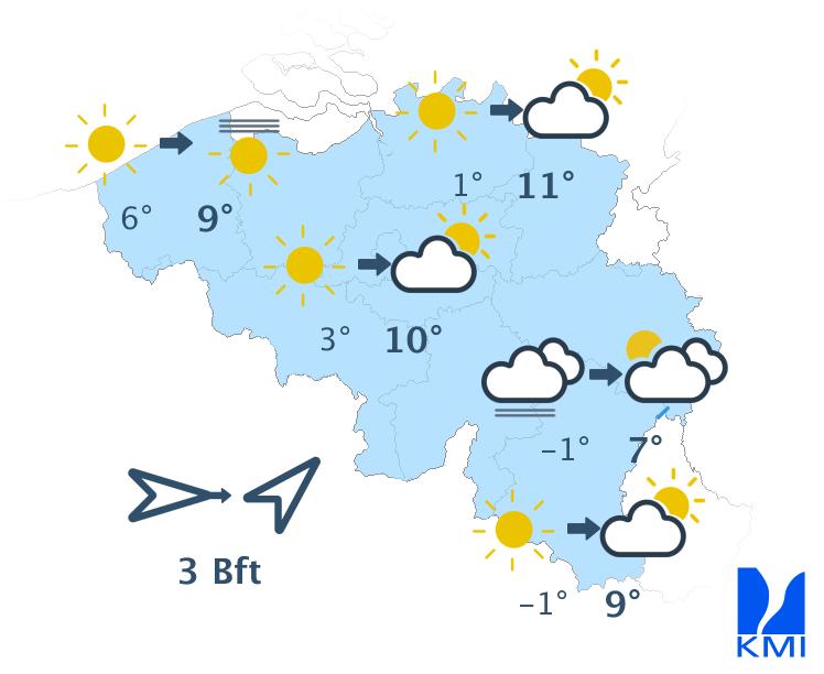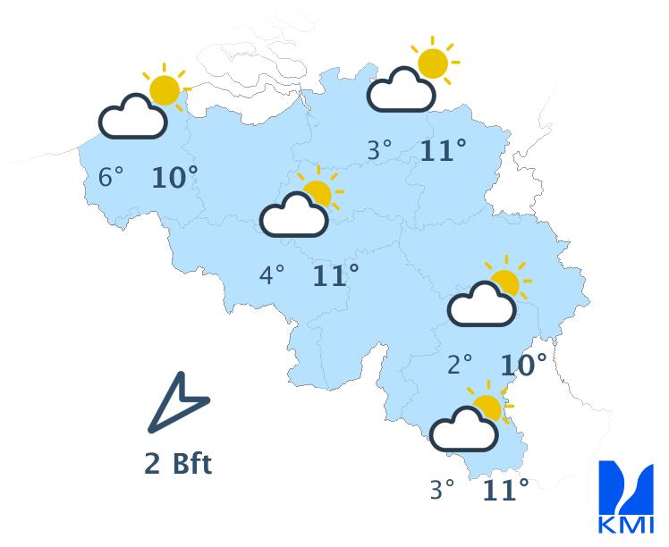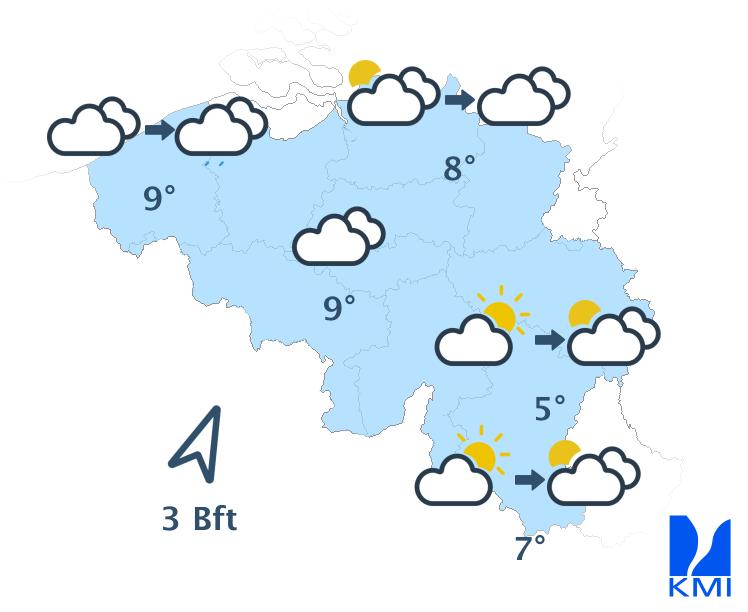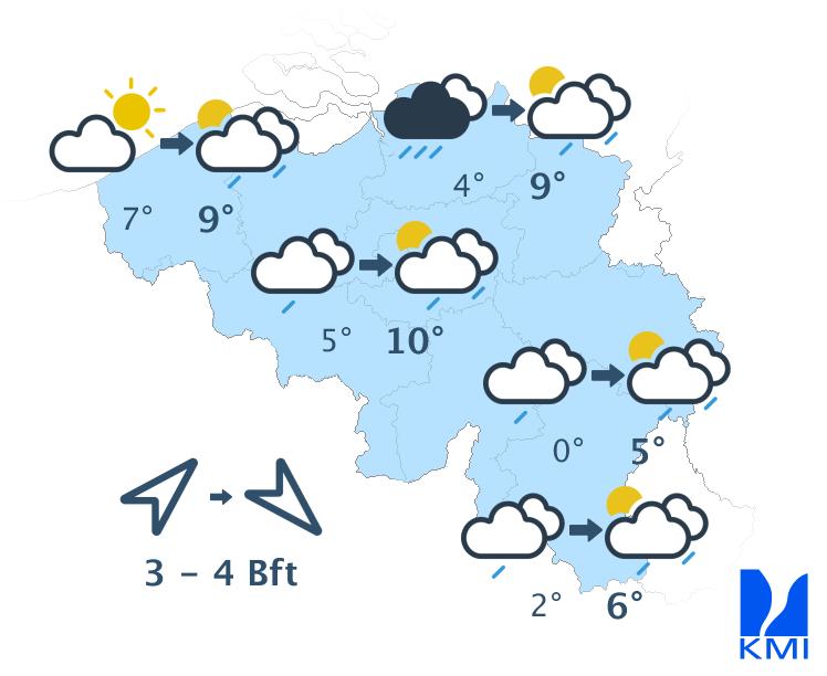 Deze namiddag klaart het eindelijk op in het zuidoosten van het land, maar geleidelijk krijgen we ook daar meer bewolking. In het westen en het centrum van het land is die reeds aanwezig. In de tweede helft van de namiddag kan er in het westen al wat regen of motregen vallen. De maxima liggen tussen 4 graden in de Hoge Venen en 10 graden in Laag- en Midden-België. Er staat een matige zuiden- tot zuidwestenwind, behalve in Hoog-België waar hij eerder zwak en soms variabel is.