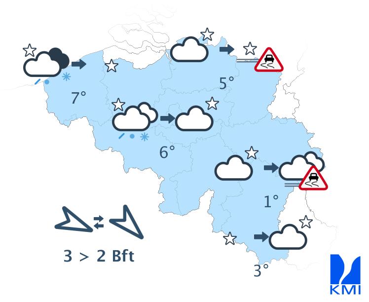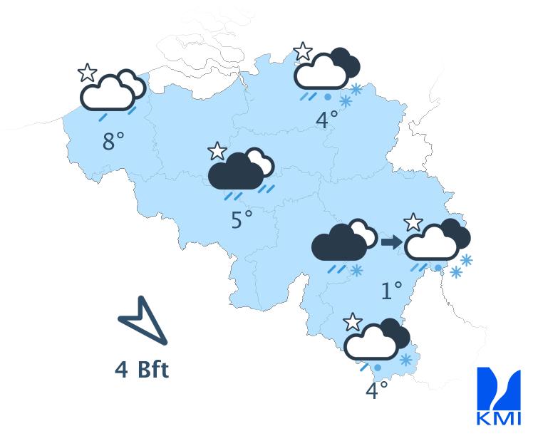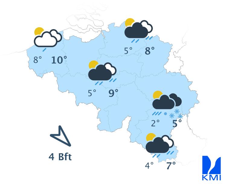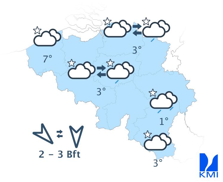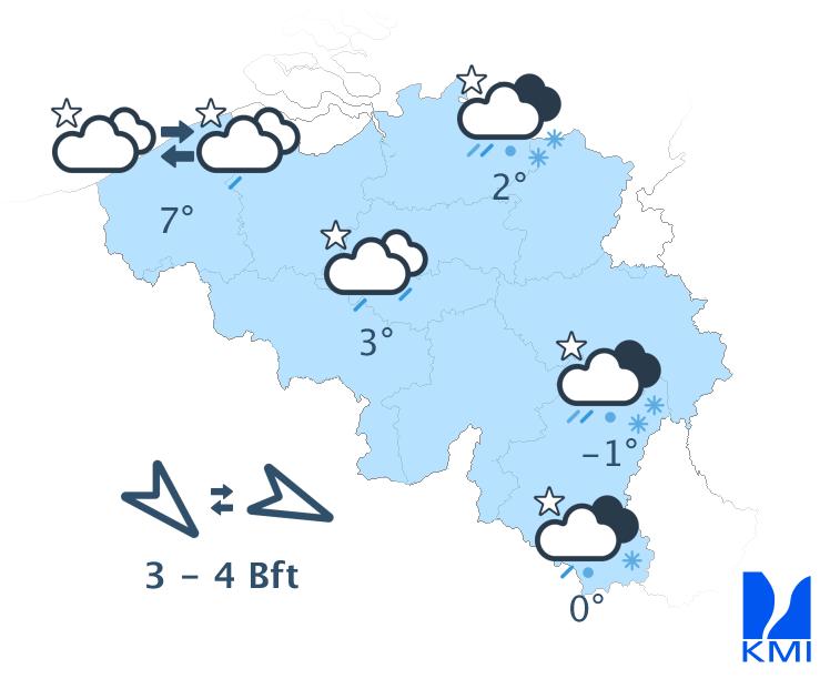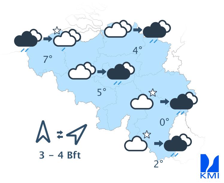 Vanavond is het vaak betrokken met regen in het westen van het land. Vannacht schuift de regenzone op naar het centrum, en aan het einde van de nacht ook naar het oosten. In de Hoge Ardennen kunnen er enkele sneeuwvlokken vallen en tezelfdertijd zijn er in het westen reeds opklaringen. De minima variëren tussen 0 graden op de Ardense hoogten en 7 graden aan zee. De wind is matig en draait van het zuidwesten naar het noordwesten na de doortocht van de neerslagzone. Aan zee waait hij zelfs vrij krachtig.