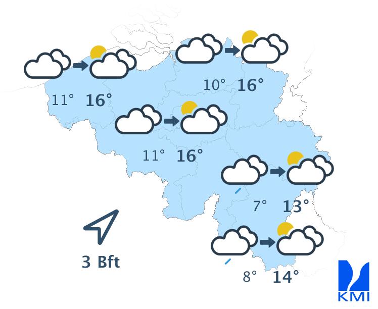Morgen is het eerst wisselend bewolkt met vooral in de noordelijke landshelft enkele opklaringen. Met name in het zuidoosten is er aanvankelijk ook nog kans op wat licht gedrup. Nadien wordt het droog maar meestal zwaarbewolkt. Vanaf de tweede helft van de namiddag klaart het dan weer gedeeltelijk op. De maxima liggen tussen 13 en 16 graden bij een matige wind uit zuidwestelijke richtingen.