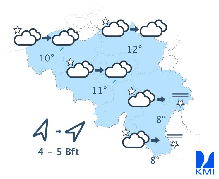 Morgenochtend zijn er eerst opklaringen mogelijk in het westen, maar daarna wordt het vaak zwaarbewolkt met opnieuw kans op wat regen of motregen. In de loop van de namiddag keren vanuit het westen opnieuw opklaringen terug met meestal droog weer. De maxima zijn zachter, tussen 13 graden in de Hoge Venen en 17 graden in het westen. De matige westenwind, aan de kust soms vrij krachtig, draait in de namiddag naar zuidwest.