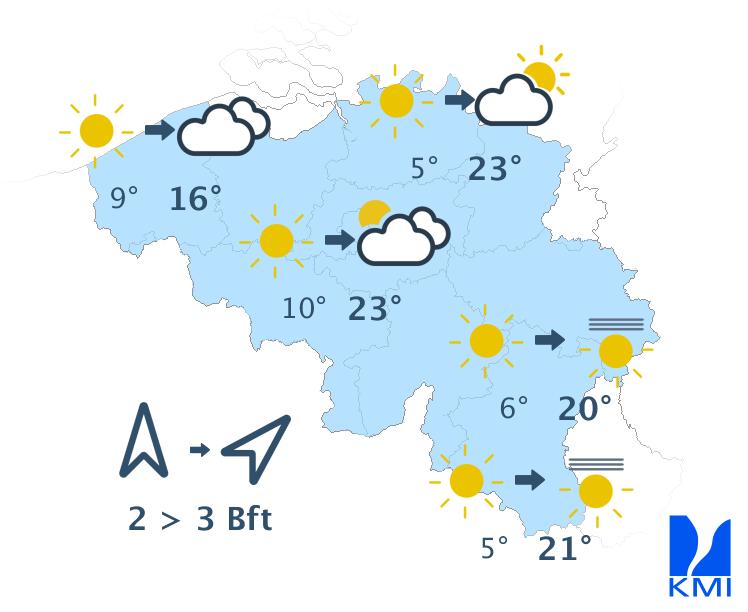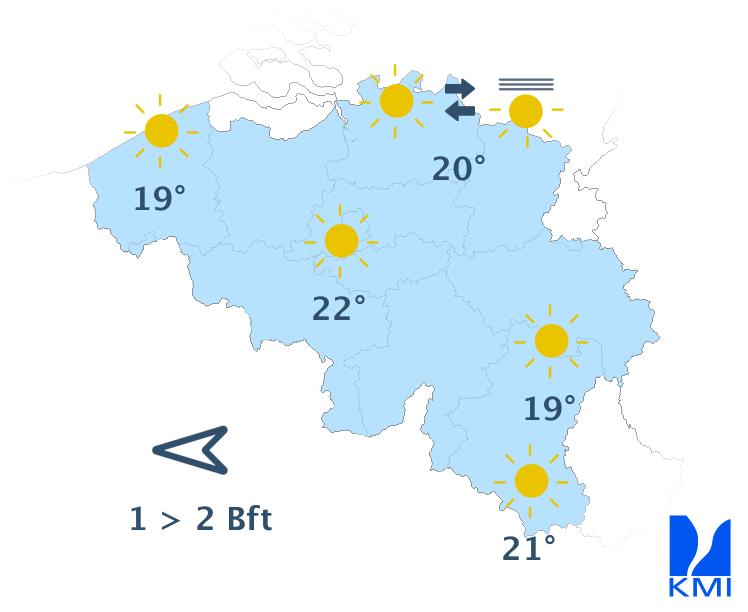 Vandaag wordt het zonnig met misschien in het noorden wat hoge wolkensluiers. De maxima liggen rond 18 graden in de Hoge Venen, rond 19 graden aan zee en rond 21 of 22 graden in de centrale regio's. De wind waait meestal zwak uit oost tot zuidoost. Aan zee kan in de namiddag een noordoostelijke zeebries ontstaan.