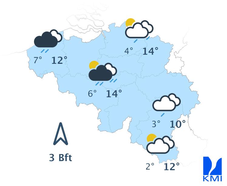 De kans op regen of buien lijkt aan te houden. De maxima liggen rond of soms boven 15 graden in Vlaanderen en het centrum van het land.