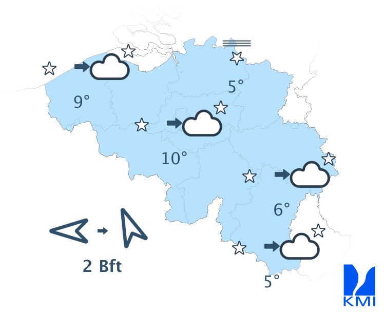 Vanavond en vannacht is het op de meeste plaatsen helder of licht bewolkt. In het noordoosten verwachten we meer hoge bewolking. De minima liggen over het algemeen tussen 3 en 10 graden. Maar in sommige Ardense valleien kan het kwik dalen tot rond of net onder het vriespunt. De wind waait zwak en ruimt in de loop van de nacht van noordoost tot oost naar zuidoost tot zuid.