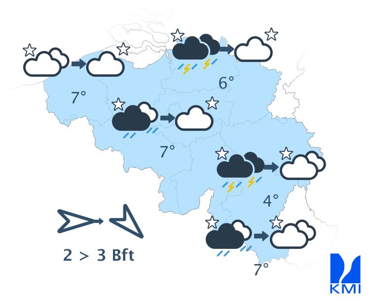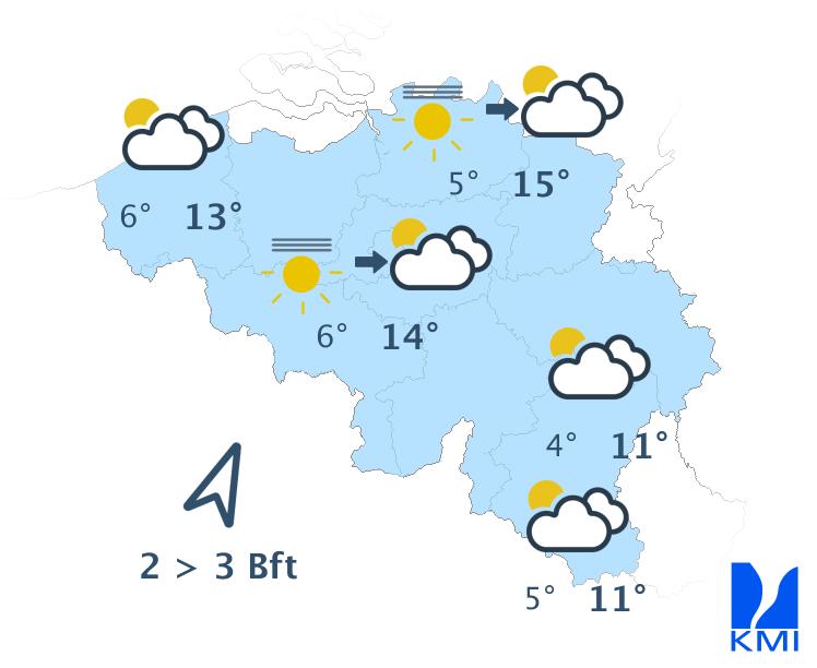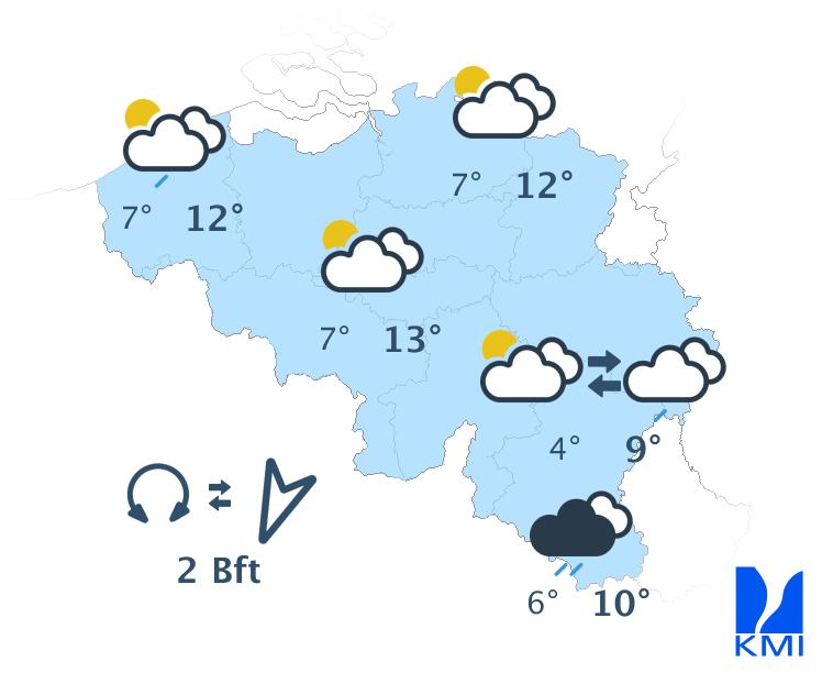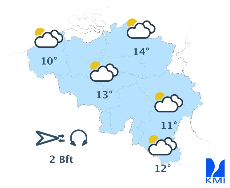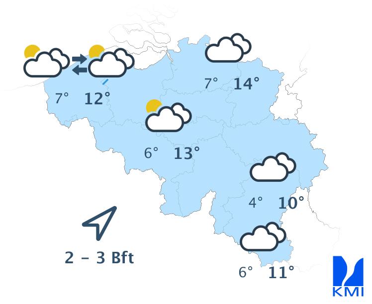 Deze namiddag verschijnt de zon soms lokaal, maar vaak blijft het bewolkt. Het is droog bij maxima van 10 à 11 graden aan zee en in de Hoge Venen tot 13 à 14 graden in Laag- en Midden-België. De wind is zwak uit veranderlijke tot westelijke richtingen.