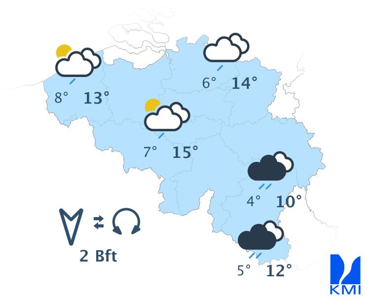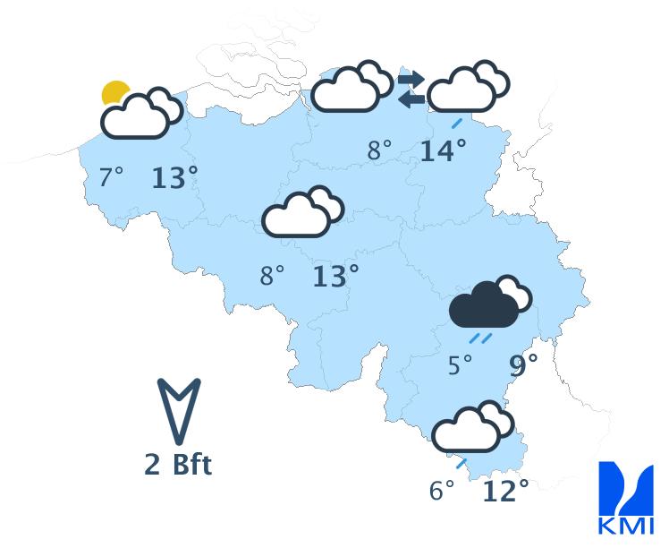 Maandag is het meestal bewolkt in de westelijke helft van het land en zwaarbewolkt tot betrokken met periodes met regen in de oostelijke helft. De maxima schommelen tussen 8 graden op de Hoge Venen en plaatselijk 14 graden in Vlaanderen. De wind is zwak tot matig uit het noorden.