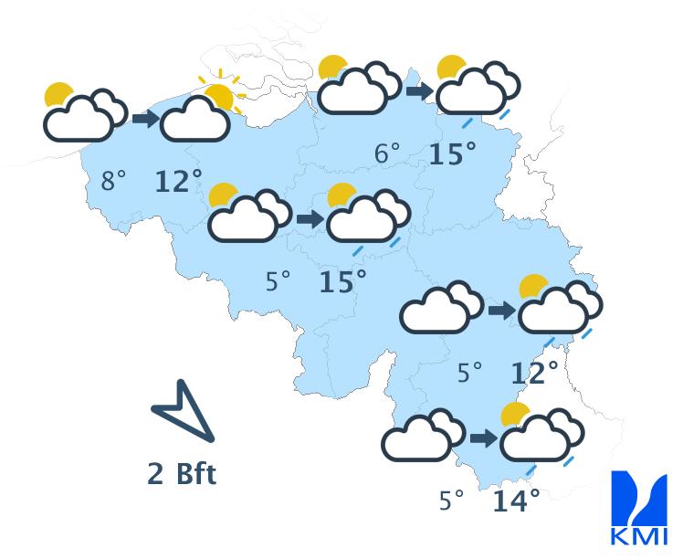 Morgen krijgen we eerst opklaringen en hogere wolkenvelden. Deze opklaringen kunnen in de voormiddag tijdelijk zelfs breed worden, maar later overdag neemt de bewolking toe vanaf het westen en Frankrijk. Een storing met regen of buiige neerslag bereikt het westen rond de middag en breidt zich in de namiddag naar de rest van het land uit. Enkele lokale donderslagen zijn niet uitgesloten. Het is opnieuw veel zachter met maxima van 15 graden aan de kust, 19 of 20 graden in het centrum van het land tot 21 of eventueel hier en daar 22 graden in de Kempen. De matige zuidoostenwind ruimt in de loop van de dag naar het zuidwesten tot het westen. Aan zee wordt de wind in de namiddag vrij krachtig. Tijdens buien zijn rukwinden tot 60 km/u of wat meer mogelijk.
