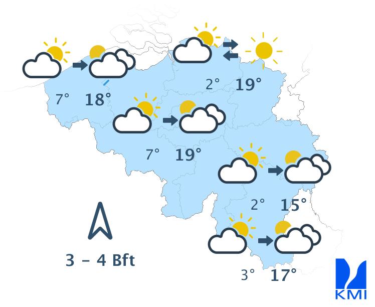 Na het ochtendgrijs verwachten we maandag afwisselend zon en wolken. Er komen enkele buien tot ontwikkeling bij maxima van 10 graden in de Ardennen tot 13 graden in het centrum. De noordnoordwestenwind is matig.