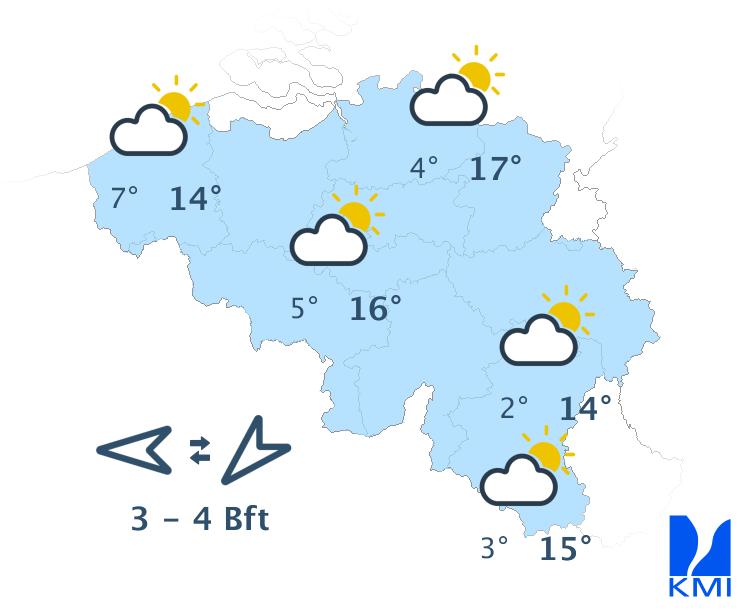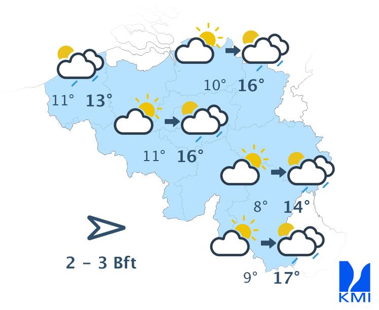 Vrijdagochtend zijn de opklaringen vaak breed. In de loop van de dag ontstaan er meer wolken en wordt het wisselend tot soms zwaarbewolkt. Hier en daar kan er een buitje vallen, maar het blijft overwegend droog. We halen maxima van 16 of 17 graden in de Ardennen, 19 graden in het centrum tot lokaal 20 graden in Vlaanderen. De zwakke zuidenwind draait naar het zuidwesten en wordt dan matig over het westen.