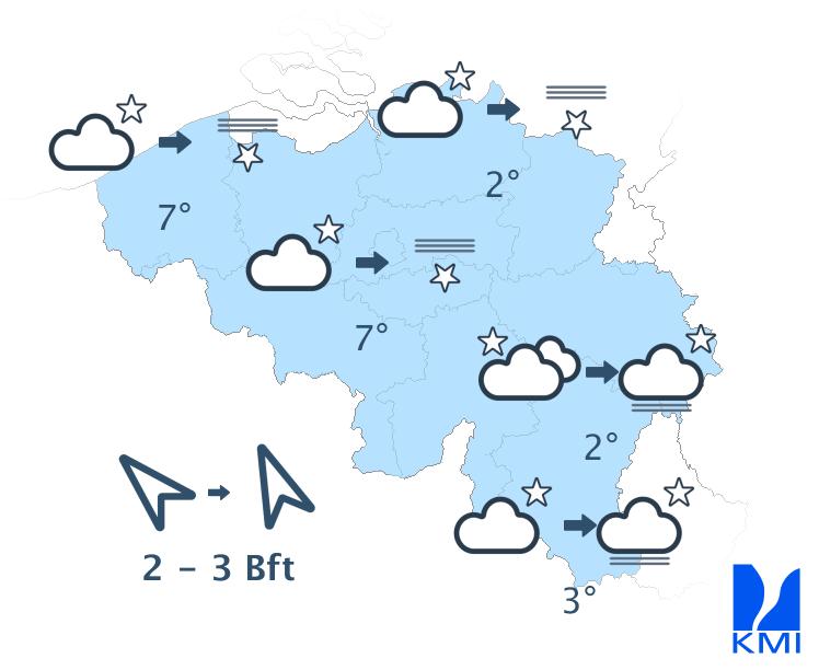 Vanavond verwachten we vaak wolken, maar soms ook lokale opklaringen. Plaatselijk valt er wat lichte regen. Vannacht is het al snel droog over het westen met opklaringen. Elders valt er eerst plaatselijke buiige neerslag die op het einde van de nacht via het oosten ons land verlaat. Geleidelijk verschijnen er ook in het centrum opklaringen. Zeer lokaal is er kans op enkele mistbanken. De minima schommelen tussen 6 en 10 graden. De zwakke tot matige zuidenwind draait naar het zuidwesten.