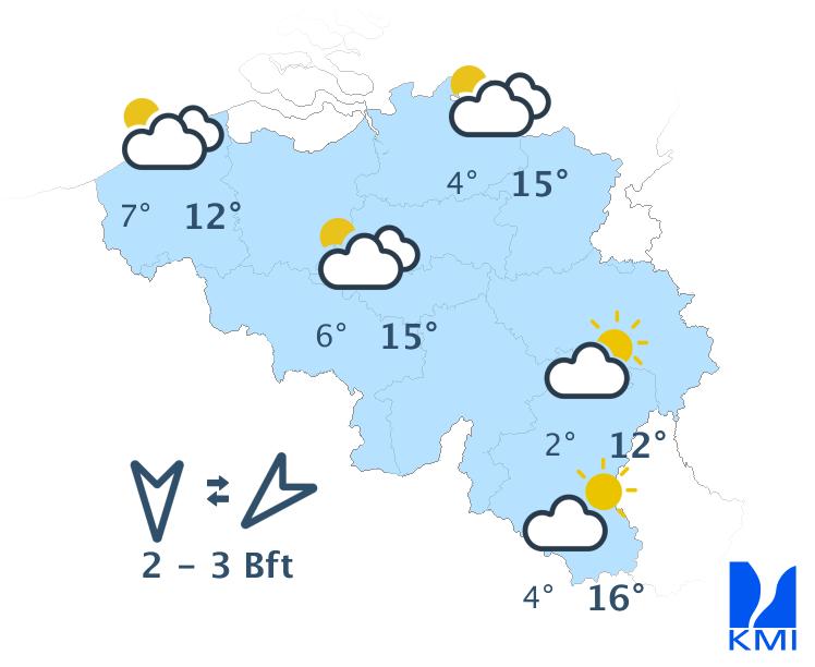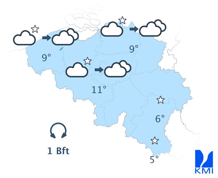 Vanavond is er nog enige tijd een bui mogelijk maar over het algemeen worden de opklaringen toch breder. In de nacht kan er zich in het noordwesten van het land opnieuw mist vormen. Tegen het eind van de nacht neemt de bewolking en de kans op buien toe vanaf het zuidwesten. De minima liggen tussen 2 en 7 graden in de Ardennen en tussen 7 en 9 graden elders. De wind is zwak uit zuid tot zuidwest of veranderlijke richtingen.