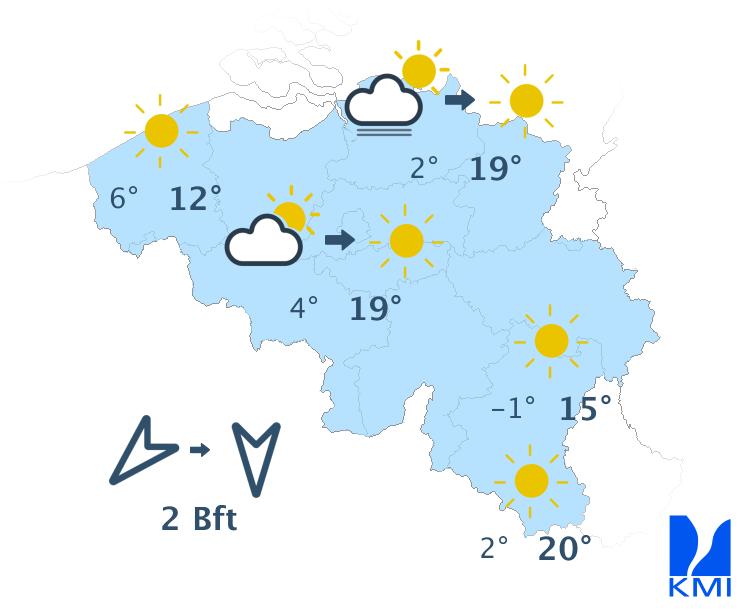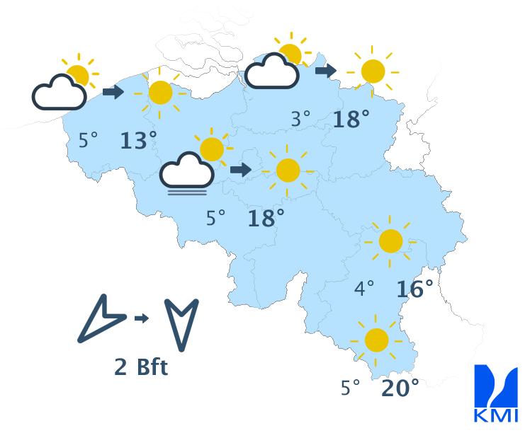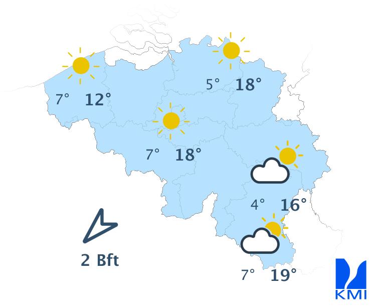 Woensdag is het zonnig met maxima van 12 of 13 graden in de Hoge Venen tot lokaal 18 graden in Vlaanderen. De oosten- tot noordoostenwind neemt snel toe tot matig in het binnenland en matig tot soms vrij krachtig aan zee.