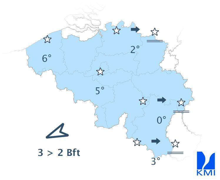 Vanavond en vannacht lossen de laatste wolkenvelden op of verdwijnen richting Frankrijk en klaart het overal op. De minima liggen tussen -1 of 0 graden in de Hoge Venen, 5 graden in het centrum en 6 graden aan zee. De wind waait zwak tot matig uit het oosten tot noordoosten.