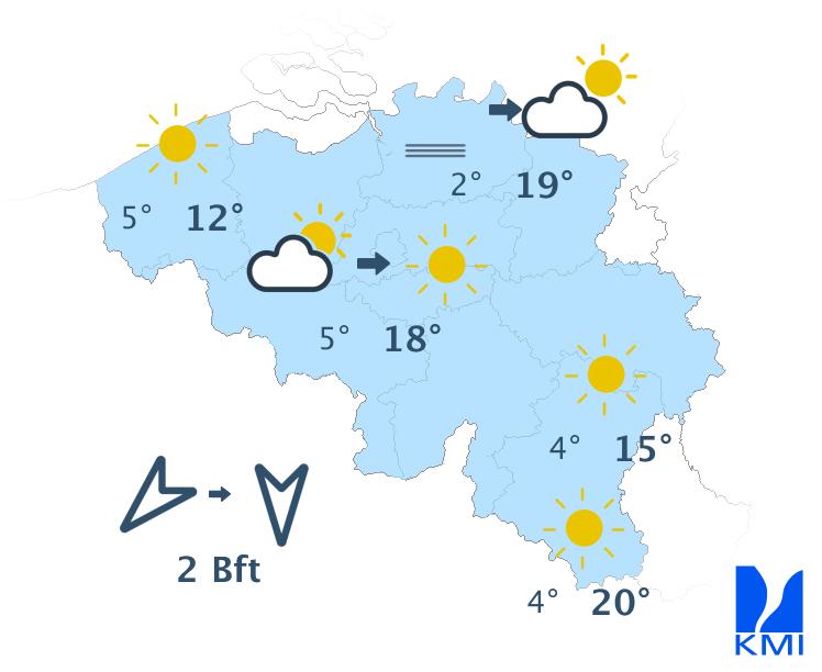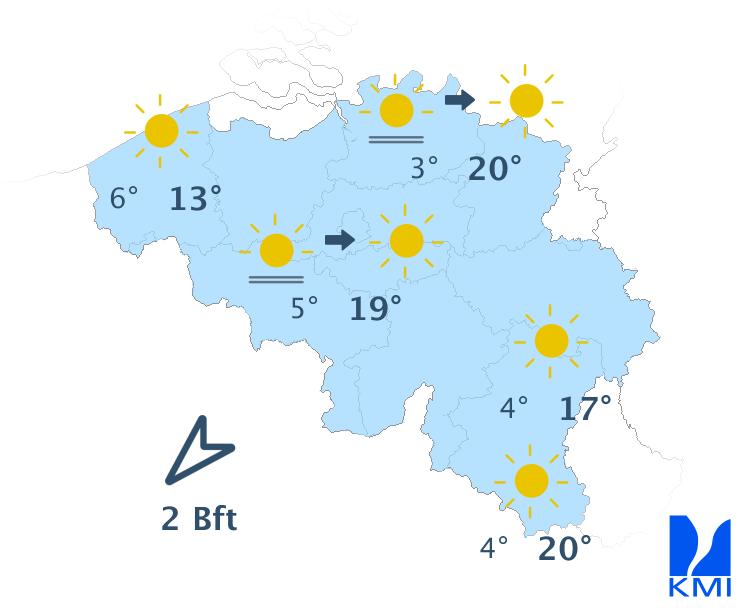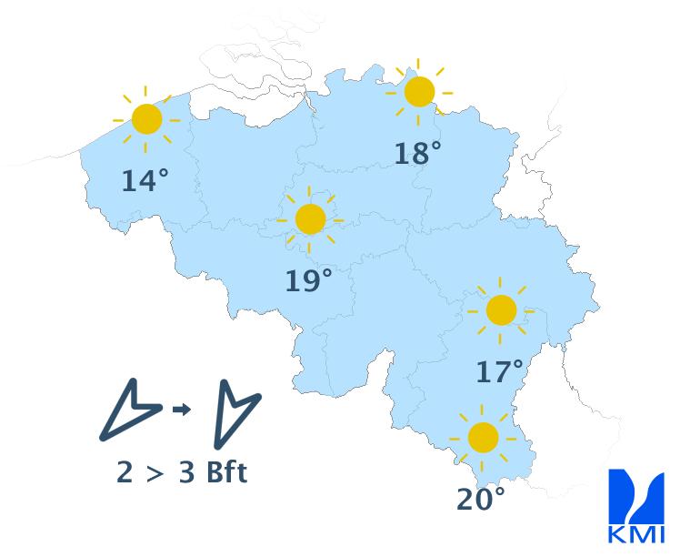 Vandaag is het opnieuw meestal zonnig met maxima van 14 of 15 graden in de Hoge Venen tot 19 of 20 graden in Laag- en Midden-België en in Belgisch Lotharingen. De zwakke tot matige oosten- tot noordoostenwind draait naar het noorden of het noordoosten. Aan zee krimpt de matige wind iets sneller naar het noorden tot het noordoosten zodat de maxima er niet hoger klimmen dan 14 of 15 graden.