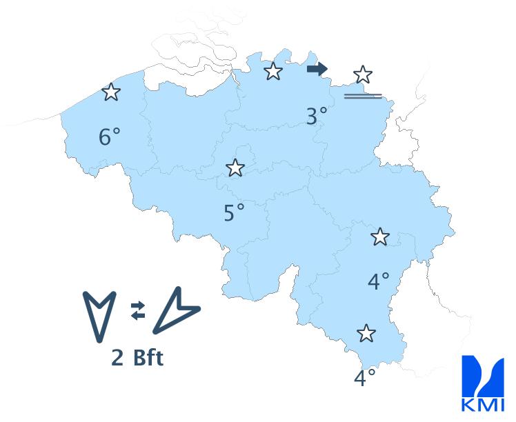 Vanavond is het helder tot lichtbewolkt. In de loop van de nacht verschijnen er lage wolken of mist over het noordoosten van het land en over de Ardennen. Meestal schommelen de minima tussen 0 en 5 graden, maar in sommige Ardense valleien kan het licht vriezen. Er waait een zwakke tot matige wind uit noord tot noordoost. Aan zee blijft de noordoostenwind matig.
