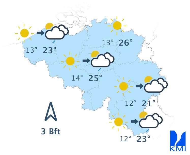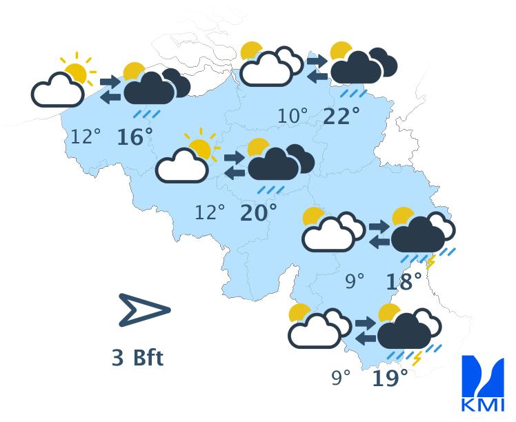 Dinsdag is het eerst gedeeltelijk bewolkt met mogelijk een lokaal buitje. In de loop van de dag wordt het langzaam zonniger. De maxima liggen tussen 13 graden vlak aan zee en 19 à 20 graden in het centrum van het land. De wind wordt matig uit noordoostelijke richting. Aan zee sreekt er na de middag een stevige zeebries op uit noordnoordoost.