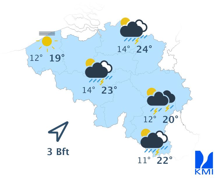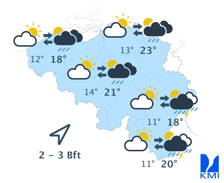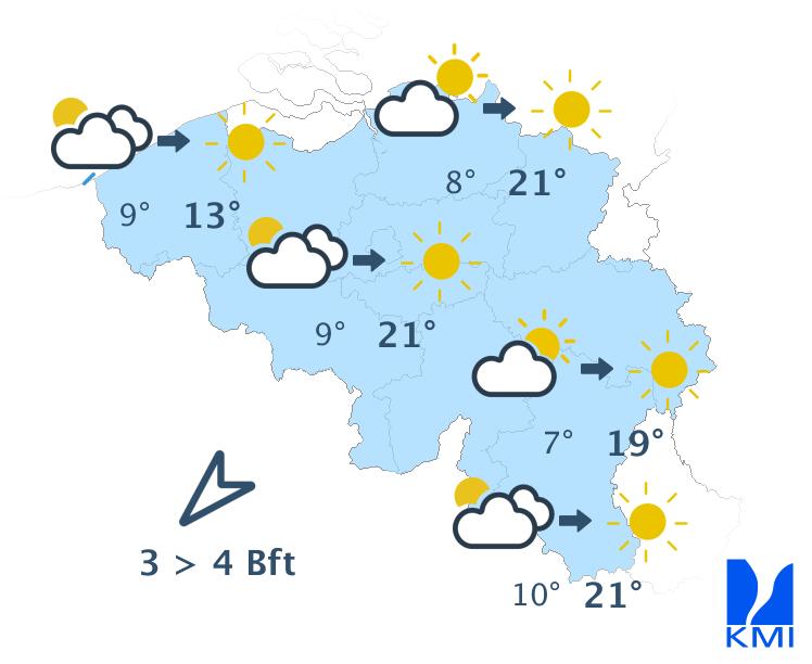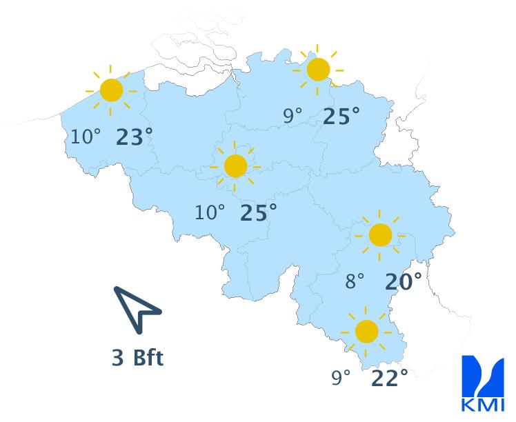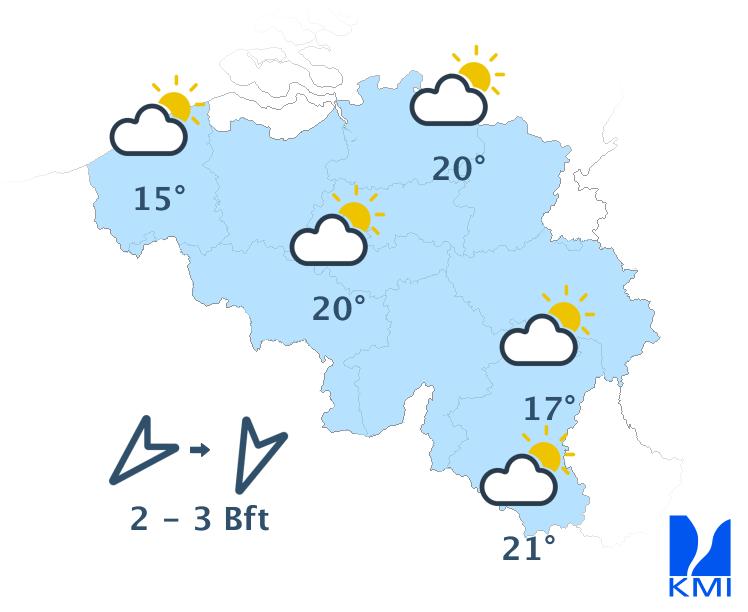 Na het snelle oplossen van het eventuele ochtendgrijs in Vlaanderen wordt het vrij zonnig. In de andere streken is het al zonnig vanaf de ochtend met soms wat hoge sluierwolken. De maxima schommelen van 14 graden aan zee, rond 19 graden in Laag- en Midden-België en 20 graden in het uiterste zuiden. De wind waait zwak uit noordoost. Aan zee wordt de wind in de loop van de namiddag matig uit noord tot noordoost.
