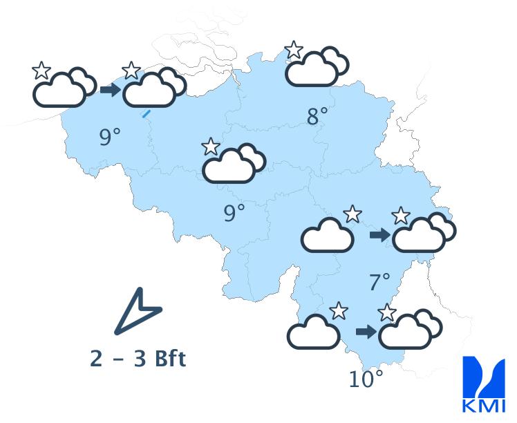 Vanavond en in het begin van de nacht is het lichtbewolkt met enkele hoge sluierwolken. Tijdens het tweede deel van de nacht is er lokaal kans op nevel of enkele mistbanken. De minima schommelen tussen 0 en 7 graden met plaatselijk negatieve temperaturen in sommige valleien van het oosten van de Ardennen. In de Kempen en ten zuiden van Samber en Maas vriest het aan de grond. Er waait een zwakke wind uit noord tot noordoost.